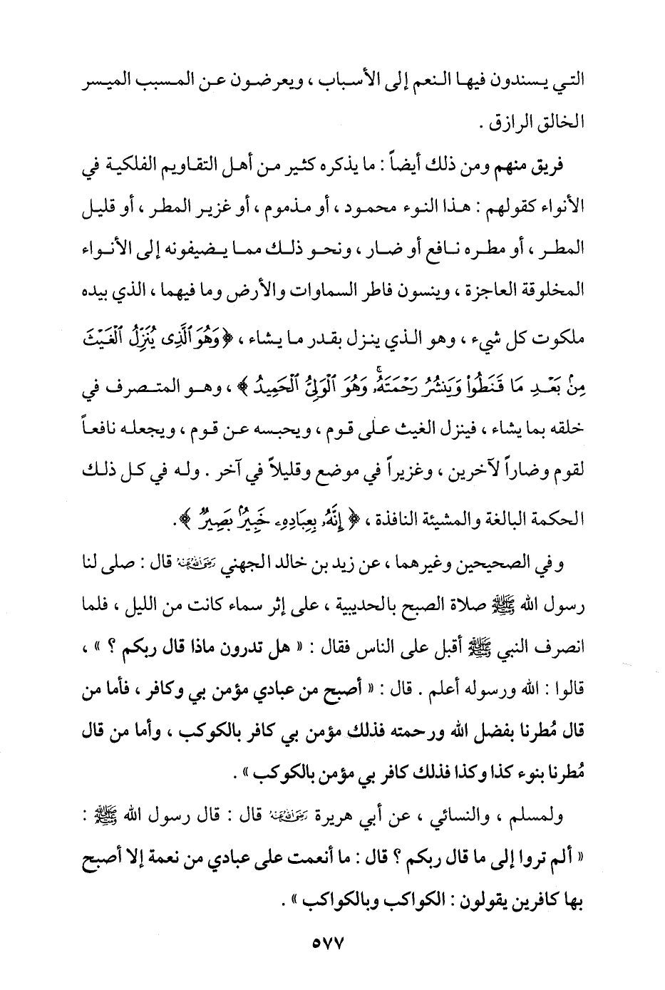 وفي الصحيحين وغيرهما، عن زيد بن خالد الجهني - رضي الله عنه - قال: صلَّى لنا رسول الله - صلى الله عليه وسلم - صلاة الصبح بالحديبية، على إثر سماء كانت من الليل، فلما انصرف النبي - صلى الله عليه وسلم - أقبل على الناس فقال: «هل تدرون ماذا قال ربكم؟» قالوا: الله ورسوله أعلم، قال: «أصبح من عبادي مؤمن بي وكافر، فأما من قال: مُطرنا بفضل الله ورحمته فذلك مؤمن بي كافر بالكوكب، وأما من قال مطرنا بنوء كذا وكذا فذلك كافر بي مؤمن بالكوكب».