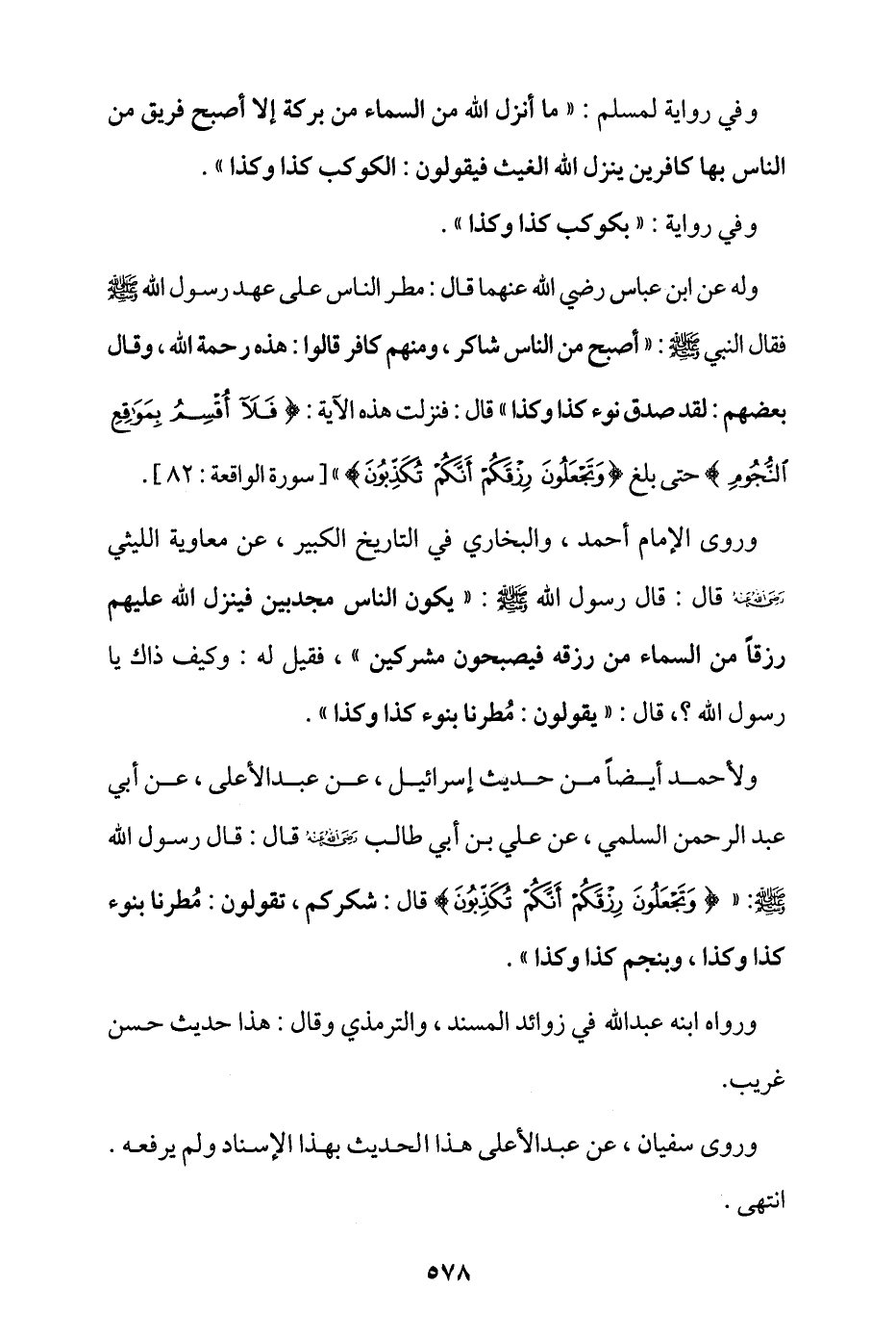 وله عن ابن عباس -رضي الله عنهما- قال: مُطر الناس على عهد رسول الله - صلى الله عليه وسلم - فقال النبي - صلى الله عليه وسلم -: «أصبح من الناس شاكر، ومنهم كافر؛ قالوا: هذه رحمة الله، وقال بعضهم: لقد صدق نوء كذا وكذا» قال: فنزلت هذه الآية: {فَلَا أُقْسِمُ بِمَوَاقِعِ النُّجُومِ} حتى بلغ {وَتَجْعَلُونَ رِزْقَكُمْ أَنَّكُمْ تُكَذِّبُونَ} [سورة الواقعة: 82].