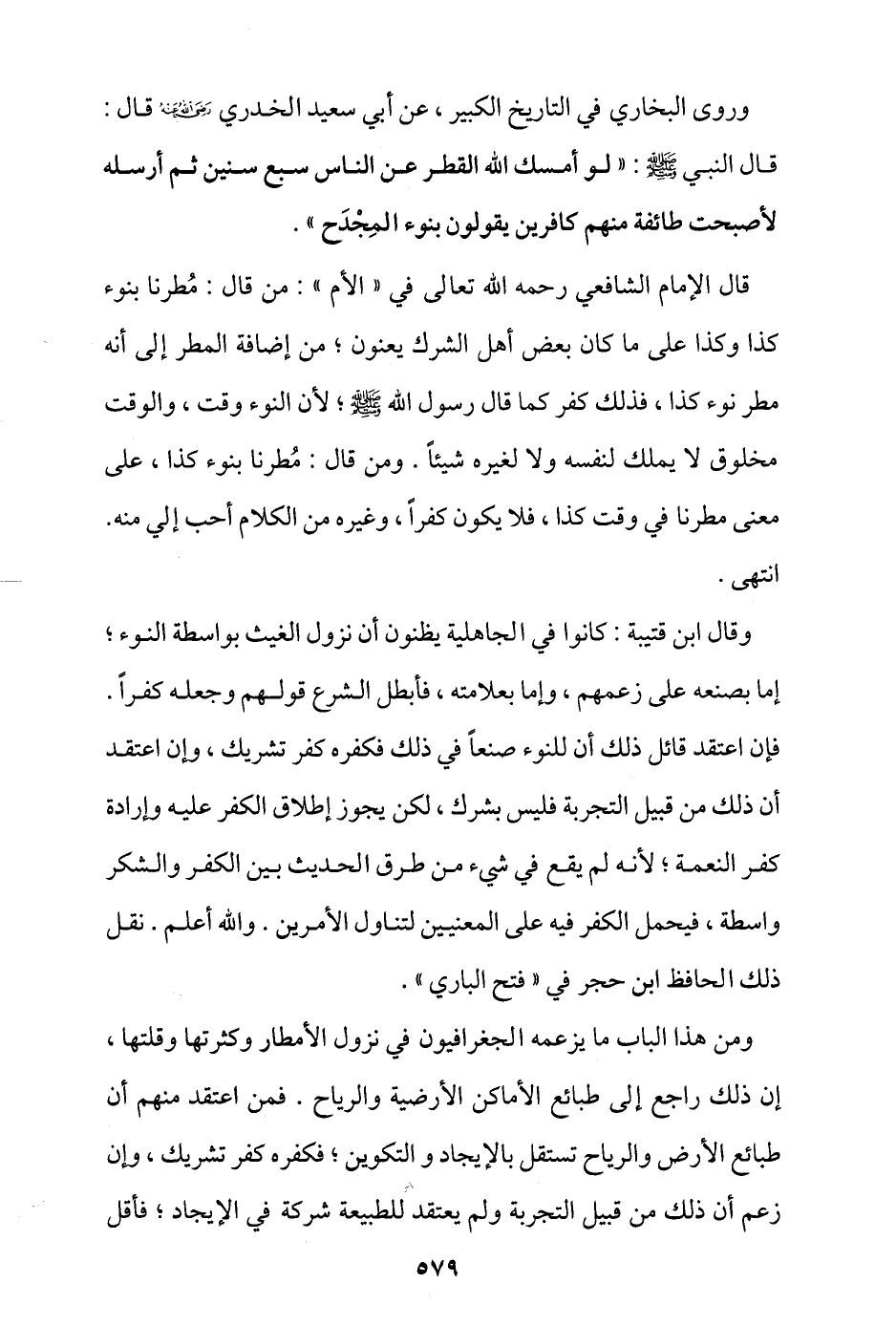 وروى البخاري في (التاريخ الكبير)، عن أبي سعيد الخدري - رضي الله عنه - قال: قال النبي - صلى الله عليه وسلم -: «لو أمسك الله القطر عن الناس سبع سنين ثم أرسله لأصبحت طائفة منهم كافرين؛ يقولون: بنوء المِجْدَح».