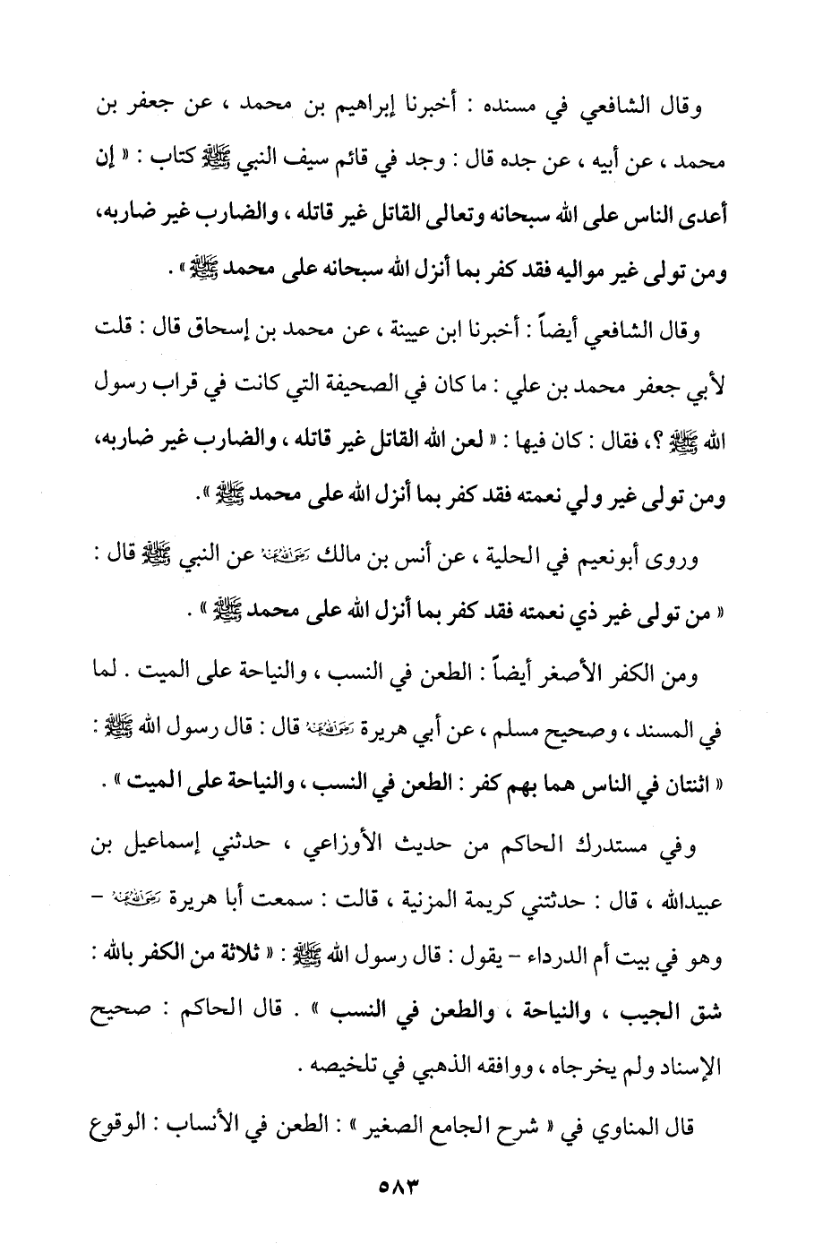 قال الشافعي في مسنده: أخبرنا إبراهيم بن محمد، عن جعفر بن محمد، عن أبيه، عن جده قال: وجد في قائم سيف النبي - صلى الله عليه وسلم - كتاب: «إن أعدى الناس على الله سبحانه وتعالى القاتل غير قاتله، والضارب غير ضاربه، ومن تولى غير مواليه فقد كفر بما أنزل الله سبحانه على محمد - صلى الله عليه وسلم -».