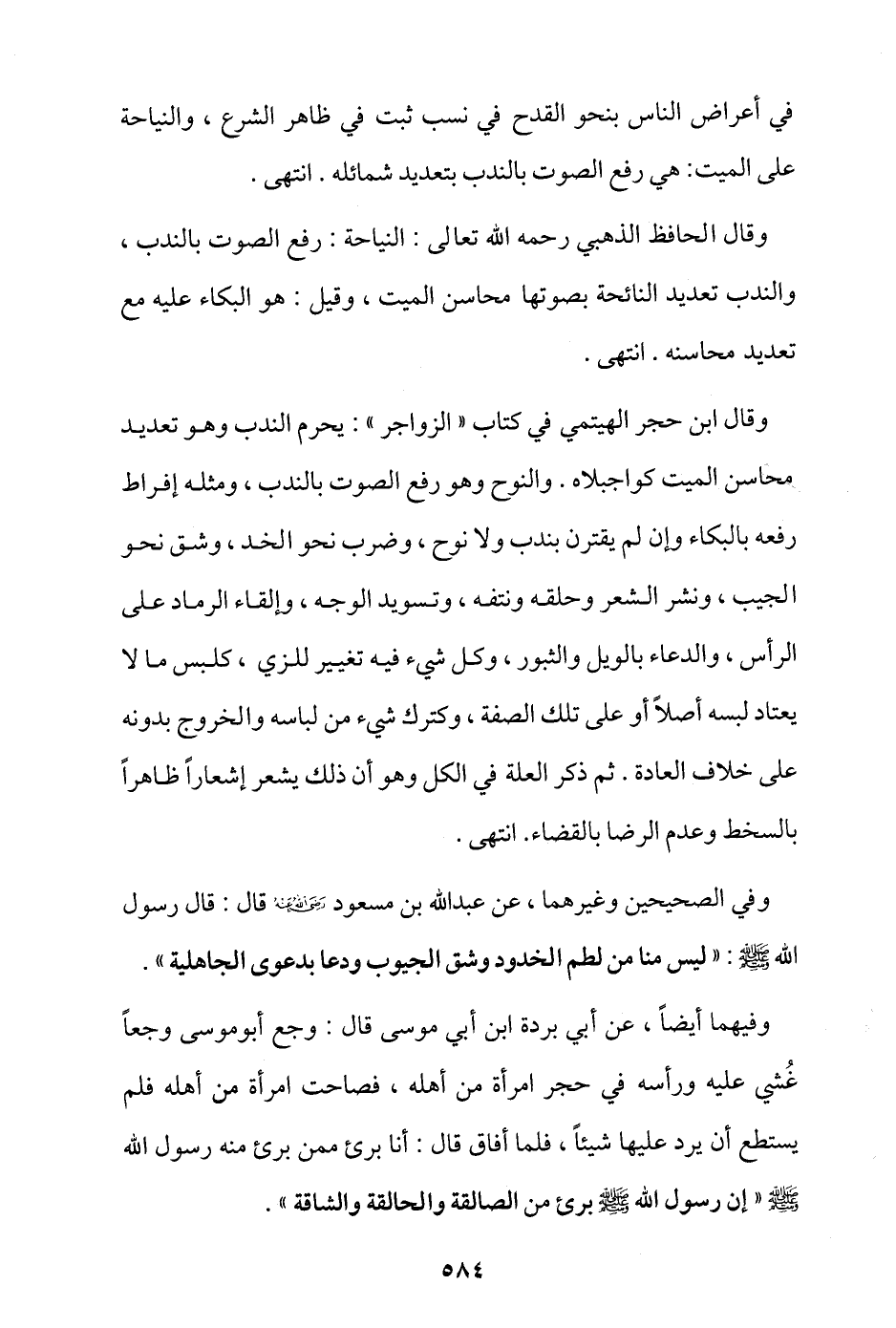 وقال ابن حجر الهيتمي في كتاب (الزواجر): يحرم الندب وهو تعديد محاسن الميت كواجبلاه، والنوح وهو رفع الصوت بالندب، ومثله إفراط رفعه بالبكاء وإن لم يقترن بندب ولا نَوْحٍ، وضرب نحو الخد، وشق نحو الجيب، ونشر الشعر وحلقه ونتفه، وتسويد الوجه، وإلقاء الرماد على الرأس، والدعاء بالويل والثبور، وكل شيء فيه تغيير للزي، كلبس ما لا يعتاد لبسه أصلا أو على تلك الصفة، وكترك شيء من لباسه والخروج بدونه على خلاف العادة، ثم ذكر العلة في الكل وهو أن ذلك يشعر إشعارًا ظاهرًا بالسخط وعدم الرضا بالقضاء. انتهى.