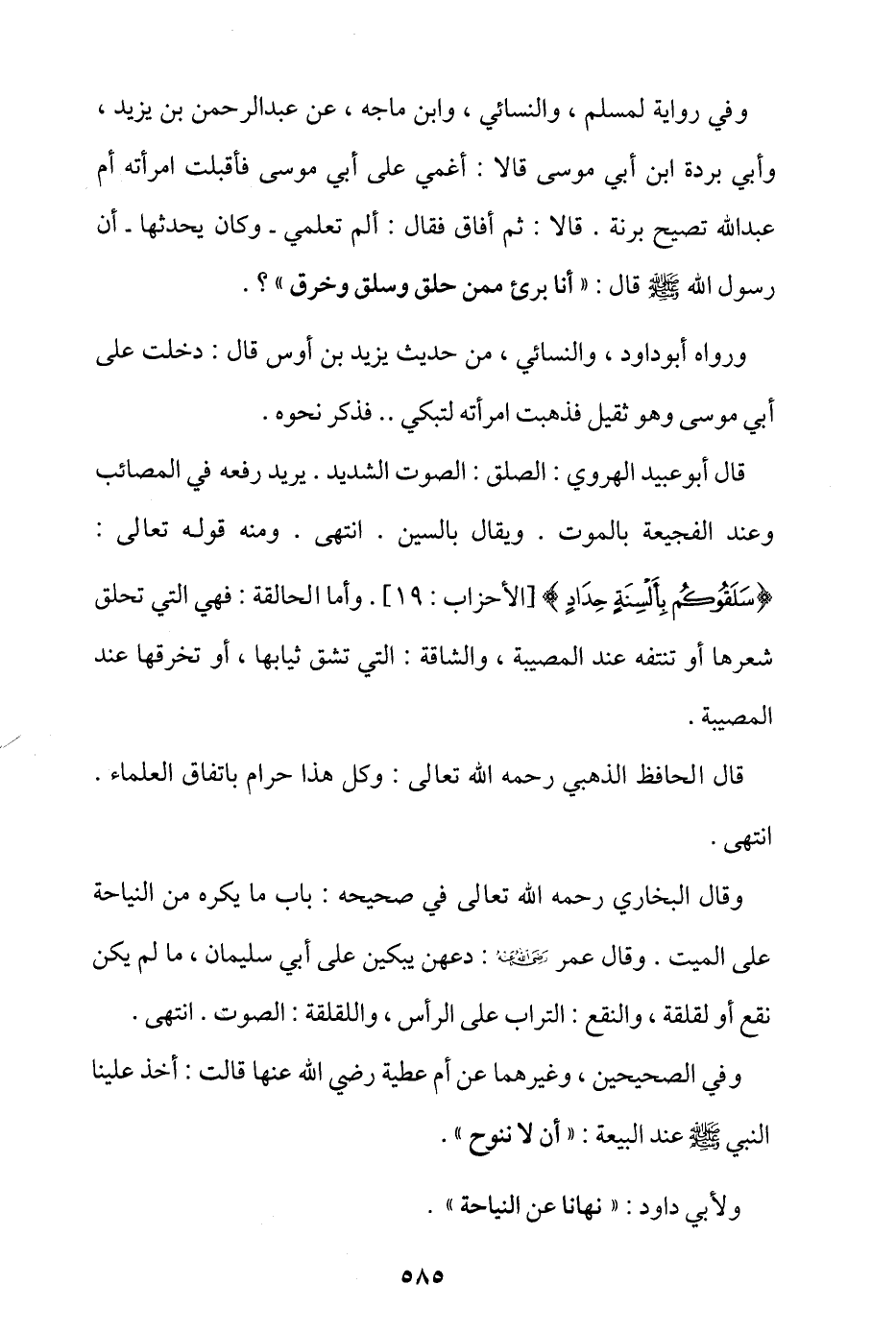 وفي رواية لمسلم، والنسائي، وابن ماجة، عن عبد الرحمن بن يزيد، وأبي بردة بن أبي موسى قالا: أغمي على أبي موسى فأقبلت امرأته أم عبد الله تصيح برنة، قالا: ثم أفاق فقال: ألم تعلمي -وكان يحدثها- أن رسول الله - صلى الله عليه وسلم - قال: «أنا بريء ممن حلق وسلق وخرق»؟