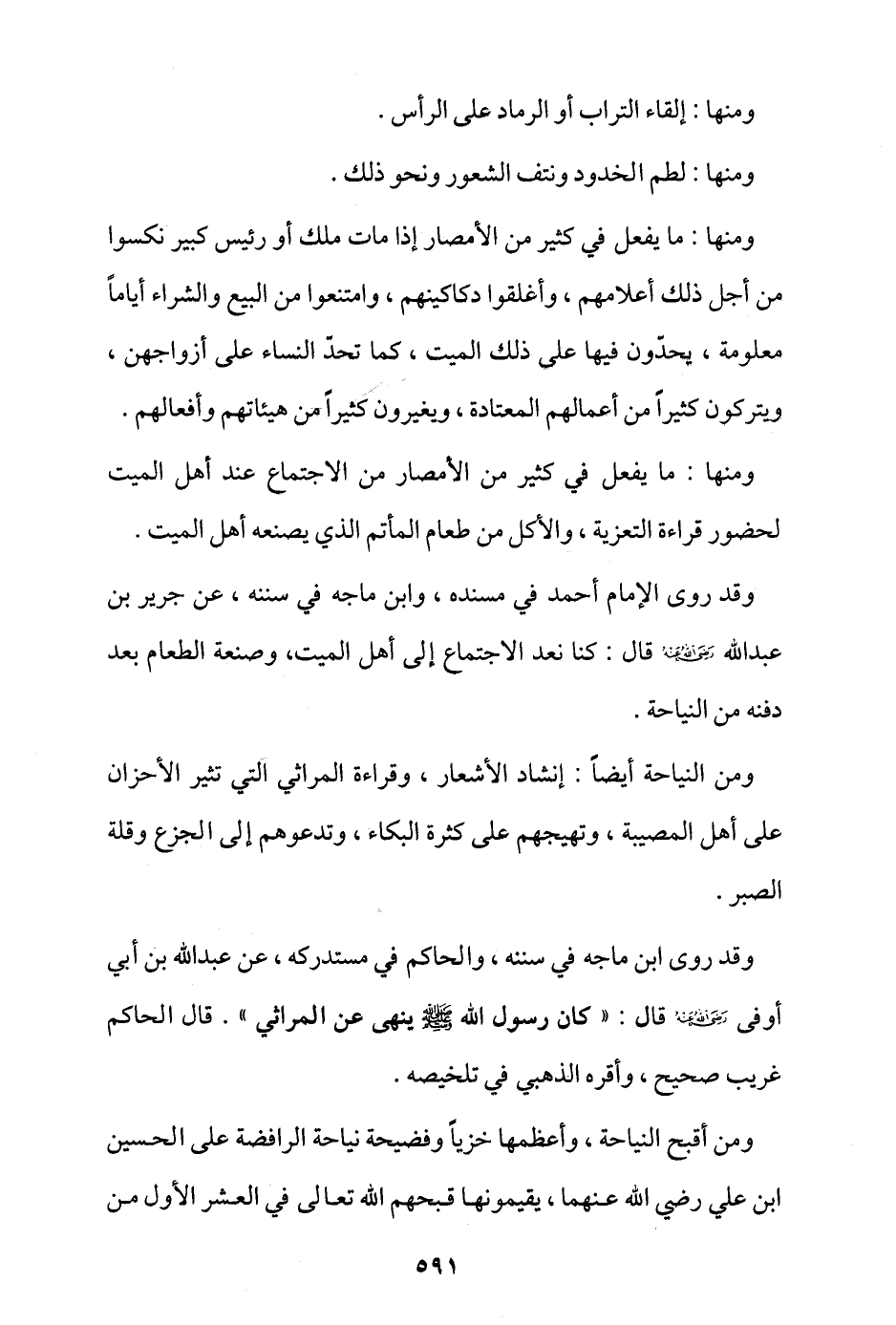 وقد روى ابن ماجة في سننه، والحاكم في مستدركه، عن عبد الله بن أبي أوفي - رضي الله عنه - قال: «كان رسول الله - صلى الله عليه وسلم - ينهى عن المراثي» قال الحاكم: غريب صحيح، وأقره الذهبي في تلخيصه.