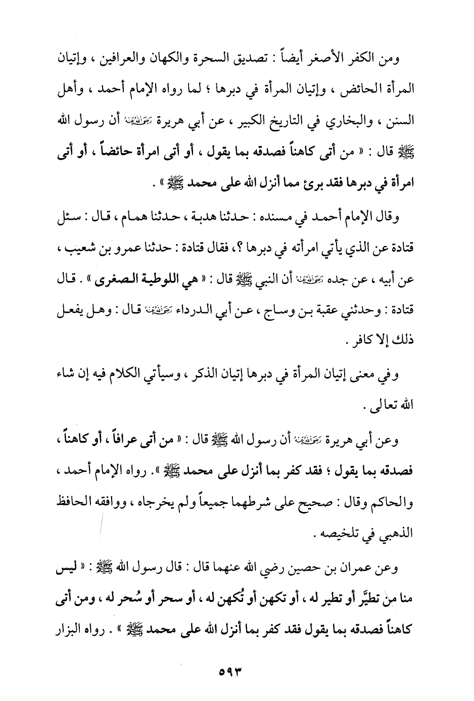 ومن الكفر الأصغر أيضا: تصديق السحرة والكهان والعرَّافين، وإتيان المرأة الحائض، وإتيان المرأة في دبرها؛ لما رواه الإمام أحمد، وأهل السنن، والبخاري في (التاريخ الكبير)، عن أبي هريرة - رضي الله عنه - أن رسول الله - صلى الله عليه وسلم - قال: «من أتى كاهنًا فصدقه بما يقول، أو أتى امرأة حائضًا، أو أتى امرأة في دبرها فقد برئ مما أنزل الله على محمد - صلى الله عليه وسلم -».