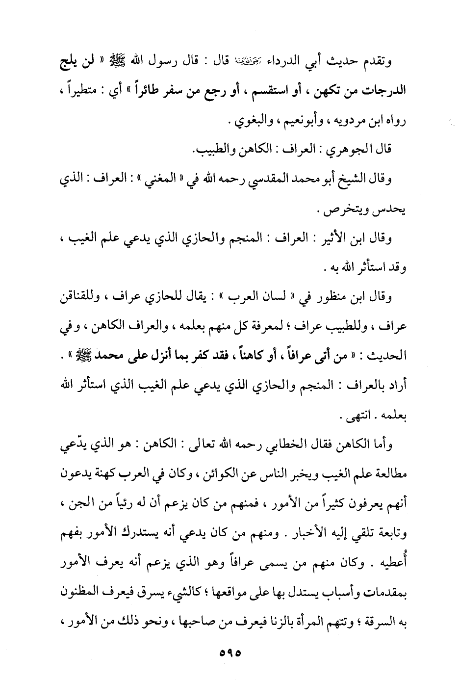 وتقدم حديث أبي الدرداء - رضي الله عنه - قال: قال رسول الله - صلى الله عليه وسلم -: «لن يلج الدرجات من تكهن، أو استقسم، أو رجع من سفر طائرًا» أي: متطيرًا. رواه ابن مردويه، وأبو نعيم، والبغوي.