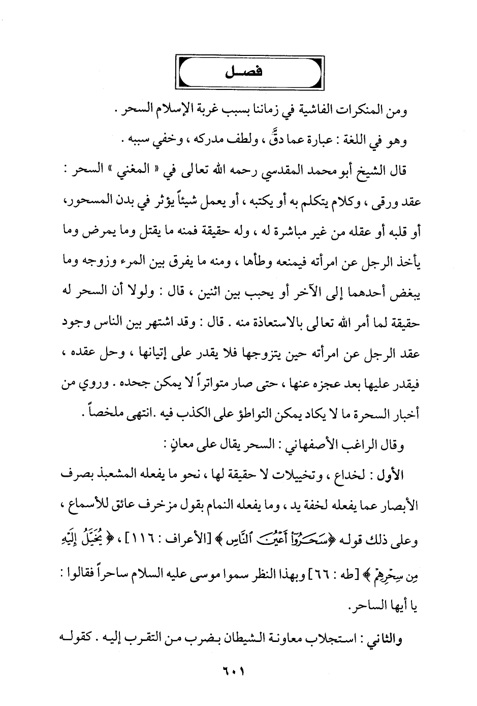 قال الشيخ أبو محمد المقدسي رحمه الله تعالى في (المغني): السحر؛ عقد ورقى، وكلام يتكلم به أو يكتبه، أو يعمل شيئا يؤثر في بدن المسحور أو قلبه أو عقله من غير مباشرة له، وله حقيقة؛ فمنه ما يقتل، وما يمرض، وما يأخذ الرجل عن امرأته فيمنعه وطأها، ومنه ما يفرق بين المرء وزوجه، وما يبغض أحدهما إلى الآخر، أو يحبب بين اثنين، قال: ولولا أن السحر له حقيقة لما أمر الله تعالى بالاستعاذة منه، قال: وقد اشتهر بين الناس وجود عقد الرجل عن امرأته حين يتزوجها فلا يقدر على إتيانها، وحل عقده فيقدر عليها بعد عجزه عنها، حتى صار متواترًا لا يمكن جحده، ورُوي من أخبار السحرة ما لا يكاد يمكن التواطؤ على الكذب فيه. انتهى ملخصًا.