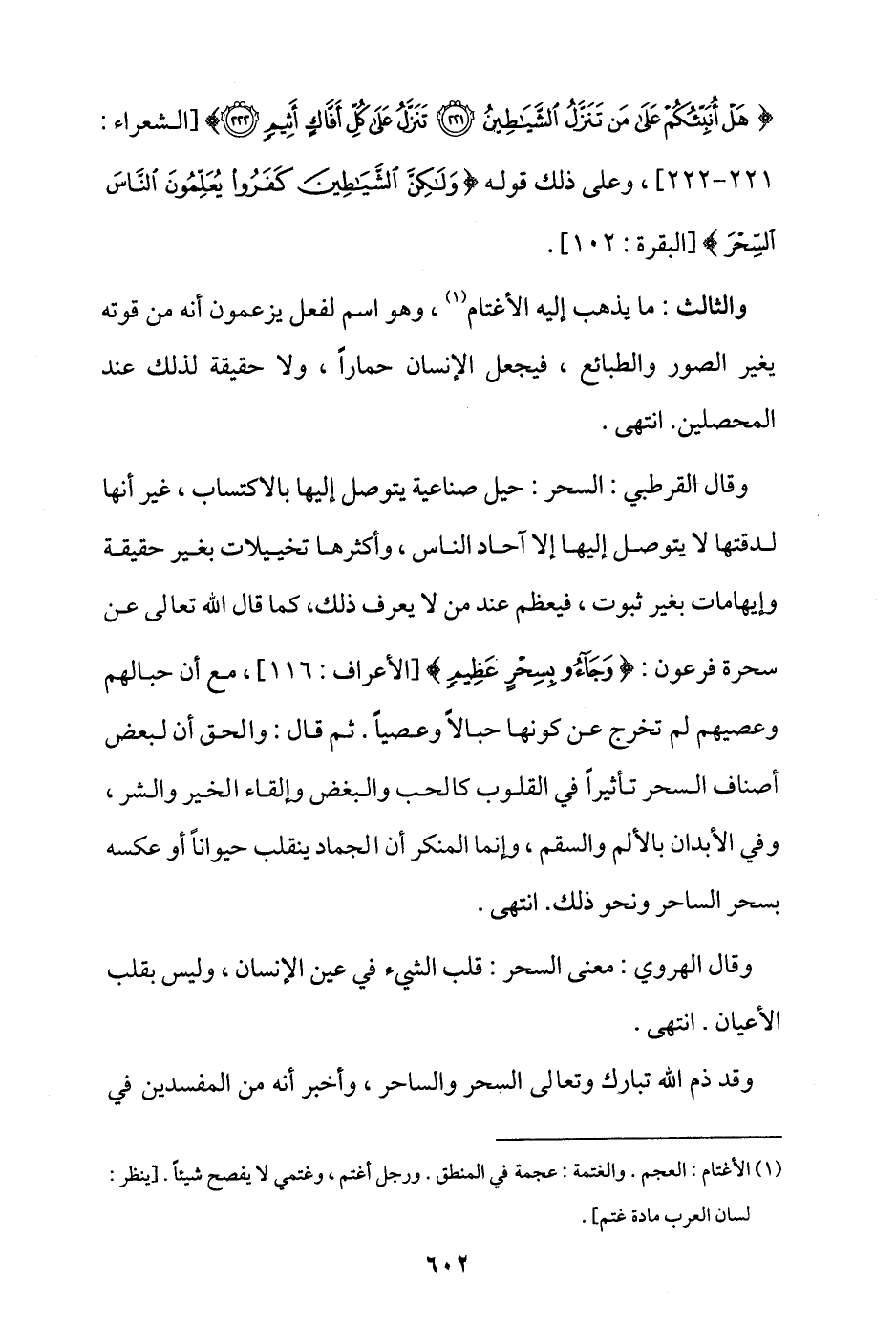 وقال القرطبي: السحر؛ حيل صناعية يتوصل إليها بالاكتساب، غير أنها لدقتها لا يتوصل إليها إلا آحاد الناس، وأكثرها تخييلات بغير حقيقة وإيهامات بغير ثبوت، فيعظم عند من لا يعرف ذلك، كما قال الله تعالى عن سحرة فرعون: {وَجَاءُوا بِسِحْرٍ عَظِيمٍ} [الأعراف: 116]، مع أن حبالهم وعصيهم لم تخرج عن كونها حبالا وعصيًا، ثم قال: والحق أن لبعض أصناف السحر تأثيرًا في القلوب؛ كالحب والبغض وإلقاء الخير والشر، وفي الأبدان بالألم والسقم، وإنما المنكر أن الجماد ينقلب حيوانًا أو عكسه بسحر الساحر ونحو ذلك. انتهى.