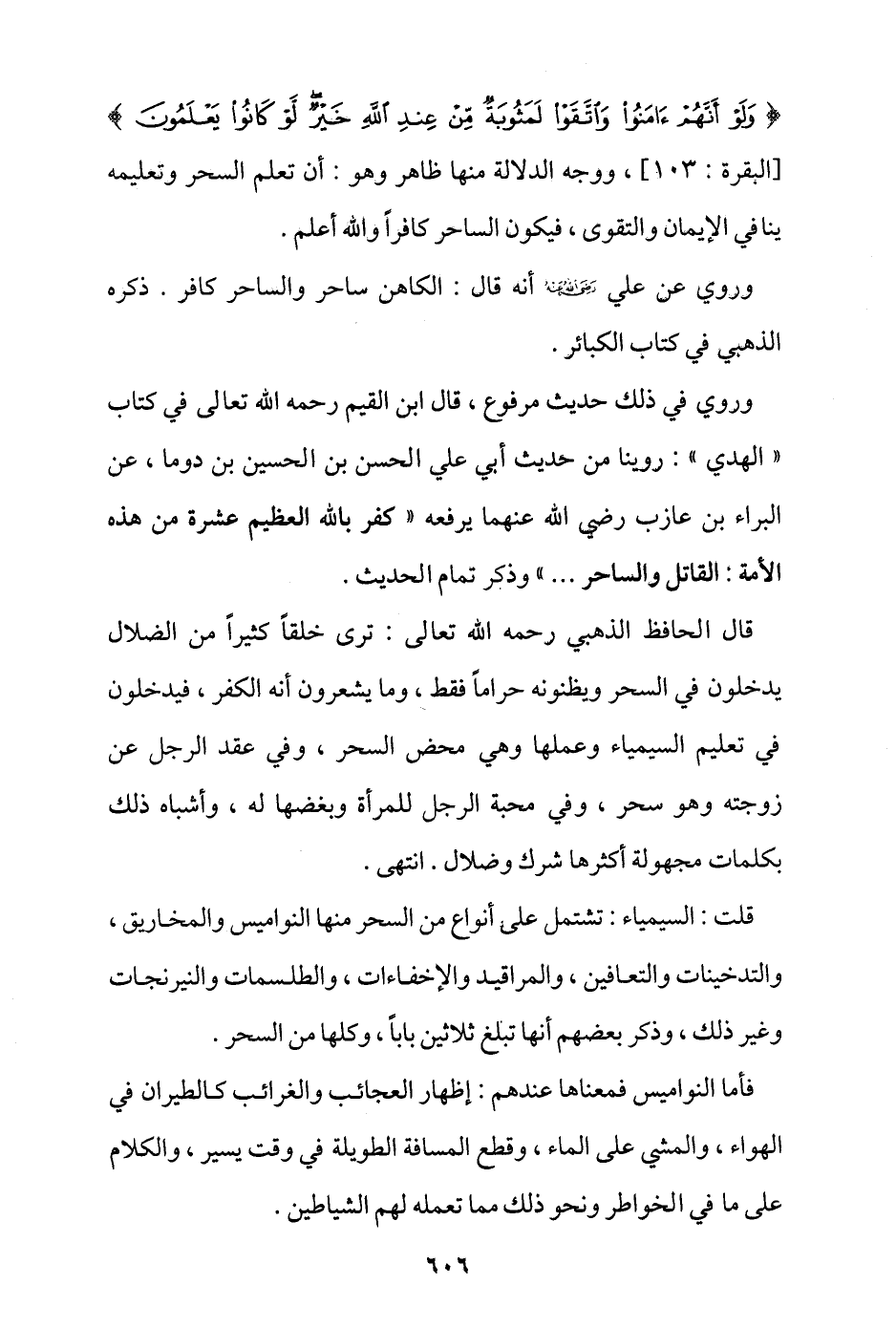 قال الحافظ الذهبي رحمه الله تعالى: ترى خلقًا كثيرًا من الضُلاَّل يدخلون في السحر ويظنونه حرامًا فقط، وما يشعرون أنه الكفر، فيدخلون في تعليم السيمياء وعملها وهي محض السحر، وفي عقد الرجل عن زوجته وهو سحر، وفي محبة الرجل للمرأة وبغضها له، وأشباه ذلك بكلمات مجهولة أكثرها شرك وضلال. انتهى.