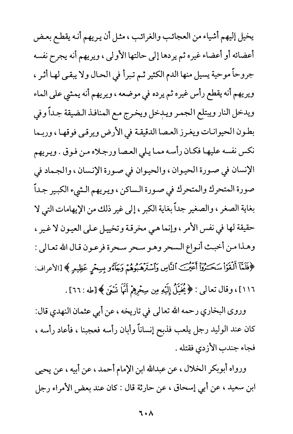 يخيل إليهم أشياء من العجائب والغرائب، مثل أن يريهم أنه يقطع بعض أعضائه أو أعضاء غيره ثم يردها إلى حالتها الأولى، ويريهم أنه يجرح نفسه جروحًا موحية يسيل منها الدم الكثير ثم تبرأ في الحال ولا يبقى لها أثر، ويريهم أنه يقطع رأس غيره ثم يرده في موضعه، ويريهم أنه يمشي على الماء ويدخل النار ويبتلع الجمر، ويدخل ويخرج من المنافذ الضيقة جدا وفي بطون الحيوانات، ويغرز العصا الدقيقة في الأرض ويرقى فوقها، وربما نكس نفسه عليها فكان رأسه مما يلي العصا ورجلاه من فوق، ويريهم الإنسان في صورة الحيوان، والحيوان في صورة الإنسان، والجماد في صورة المتحرك والمتحرك في صورة الساكن، ويريهم الشيء الكبير جدًا بغاية الصغر، والصغير جدًا بغاية الكبر، إلى غير ذلك من الإيهامات التي لا حقيقة لها في نفس الأمر، وإنما هي مخرقة وتخييل على العيون لا غير، وهذا من أخبث أنواع السحر، وهو سحر سحرة فرعون، قال الله تعالى: {فَلَمَّا أَلْقَوْا سَحَرُوا أَعْيُنَ النَّاسِ وَاسْتَرْهَبُوهُمْ وَجَاءُوا بِسِحْرٍ عَظِيمٍ} [الأعراف: 116]، وقال تعالى: {يُخَيَّلُ إِلَيْهِ مِنْ سِحْرِهِمْ أَنَّهَا تَسْعَى} [طه: 66].