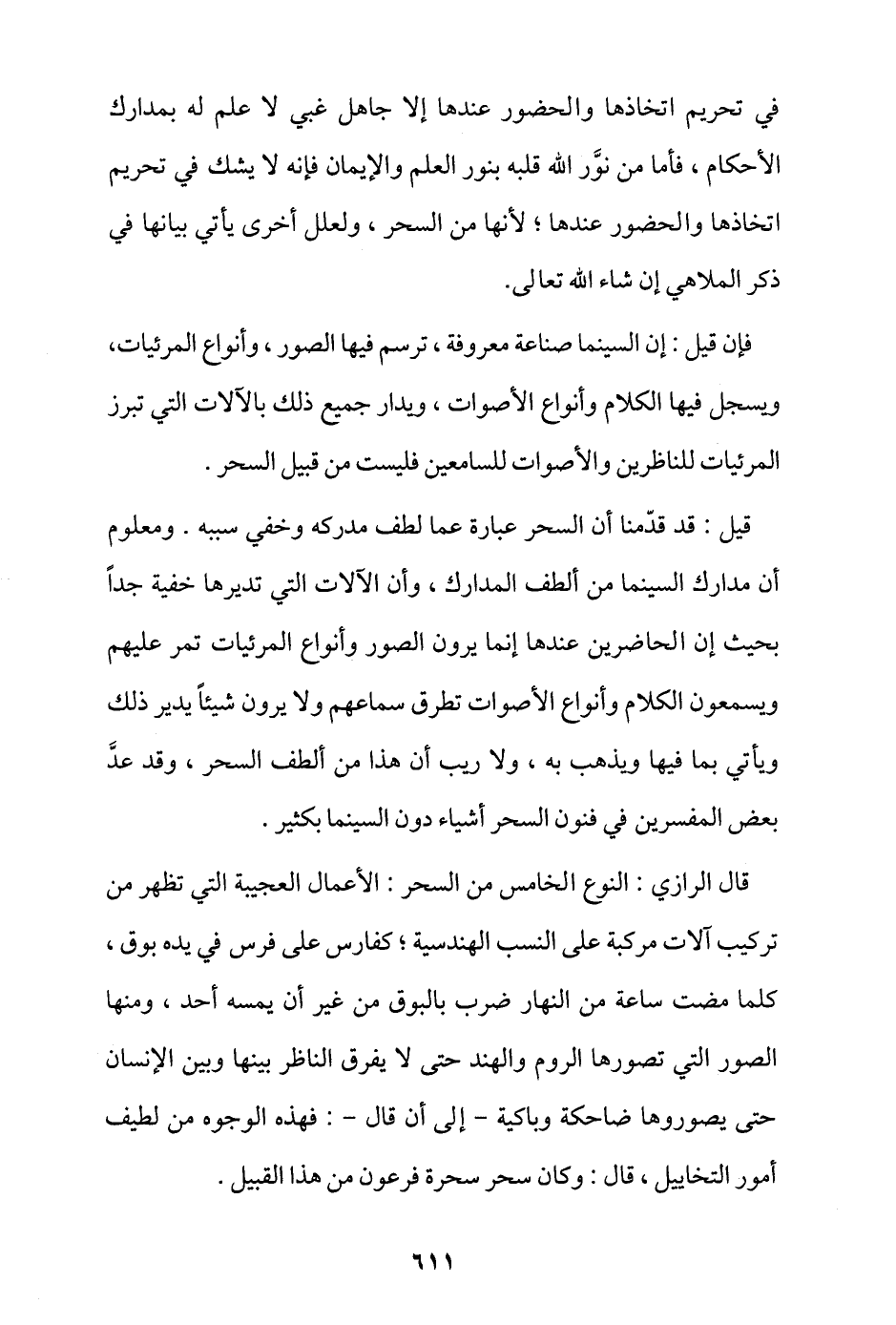 قيل: قد قدمنا أن السحر عبارة عما لطف مدركه وخفي سببه، ومعلوم أن مدارك السينما من ألطف المدارك، وأن الآلات التي تديرها خفية جدًا بحيث إن الحاضرين عندها إنما يرون الصور وأنواع المرئيات تمر عليهم ويسمعون الكلام وأنواع الأصوات تطرق سماعهم ولا يرون شيئا يدير ذلك ويأتي بما فيها ويذهب به، ولا ريب أن هذا من ألطف السحر، وقد عد بعض المفسرين في فنون السحر أشياء دون السينما بكثير.