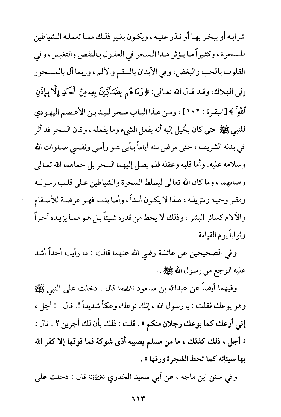 شرابه أو يبخر بها أو تذر عليه، ويكون بغير ذلك مما تعمله الشياطين للسحرة، وكثيرًا ما يؤثر هذا السحر في العقول بالنقص والتغيير، وفي القلوب بالحب والبغض، وفي الأبدان بالسقم والألم، وربما آل بالمسحور إلى الهلاك، وقد قال الله تعالى: {وَمَا هُمْ بِضَارِّينَ بِهِ مِنْ أَحَدٍ إِلَّا بِإِذْنِ اللَّهِ} [البقرة: 102]، ومن هذا الباب سحر لبيد بن الأعصم اليهودي للنبي - صلى الله عليه وسلم - حتى كان يخيل إليه أنه يفعل الشيء وما يفعله، وكان السحر قد أثر في بدنه الشريف؛ حتى مرض منه أيامًا بأبي هو وأمي ونفسي صلوات الله وسلامه عليه، وأما قلبه وعقله فلم يصل إليهما السحر بل حماهما الله تعالى وصانهما، وما كان الله تعالى ليسلط السحرة والشياطين على قلب رسوله ومقر وحيه وتنزيله، هذا لا يكون أبدًا، وأما بدنه فهو عرضة للأسقام والآلام كسائر البشر، وذلك لا يحط من قدره شيئًا بل هو مما يزيده أجرًا وثوابًا يوم القيامة.