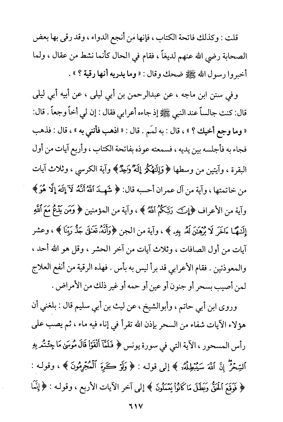 وفي سنن ابن ماجة، عن عبد الرحمن بن أبي ليلي، عن أبيه أبي ليلي قال: كنت جالسًا عند النبي - صلى الله عليه وسلم - إذ جاءه أعرابي فقال: إن لي أخًا وجعًا، قال: «وما وجع أخيك؟» قال: به لمم، قال: «اذهب فأتني به» قال: فذهب فجاء به فأجلسه بين يديه، فسمعته عوَّذه بفاتحة الكتاب، وأربع آيات من أول البقرة، وآيتين من وسطها، {وَإِلَهُكُمْ إِلَهٌ وَاحِدٌ}، وآية الكرسي، وثلاث آيات من خاتمتها، وآية من آل عمران أحسبه قال: {شَهِدَ اللَّهُ أَنَّهُ لَا إِلَهَ إِلَّا هُوَ}، وآية من الأعراف {إِنَّ رَبَّكُمُ اللَّهُ}، وآية من المؤمنين {وَمَنْ يَدْعُ مَعَ اللَّهِ إِلَهًا آَخَرَ لَا بُرْهَانَ لَهُ بِهِ}، وآية من الجن {وَأَنَّهُ تَعَالَى جَدُّ رَبِّنَا}، وعشر آيات من أول الصافات، وثلاث آيات من آخر الحشر، وقل هو الله أحد، والمعوذتين، فقام الأعرابي قد برأ ليس به بأس. فهذه الرقية من أنفع العلاج لمن أصيب بسحر أو جنون أو عين أو حُمّه أو غير ذلك من الأمراض.
