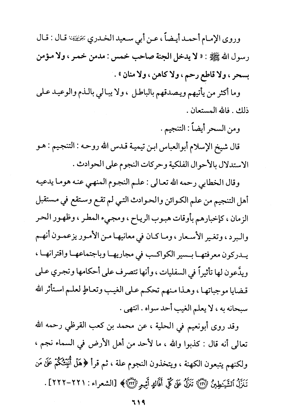 وقال الخطابي رحمه الله تعالى: علم النجوم المنهي عنه هو ما يدعيه أهل التنجيم من علم الكوائن والحوادث التي لم تقع وستقع في مستقبل الزمان، كأخبارهم بأوقات هبوب الرياح، ومجيء المطر، وظهور الحر والبرد، وتغير الأسعار، وما كان في معانيها من الأمور، يزعمون أنهم يدركون معرفتها بسير الكواكب في مجاريها وباجتماعها واقترانها، ويدعون لها تأثيرا في السلفيات، وأنها تتصرف على أحكامها وتجري على قضايا موجباتها، وهذا منهم تحكم على الغيب وتعاطٍ لعلم استأثر الله سبحانه به، لا يعلم الغيب أحد سواه. انتهى.