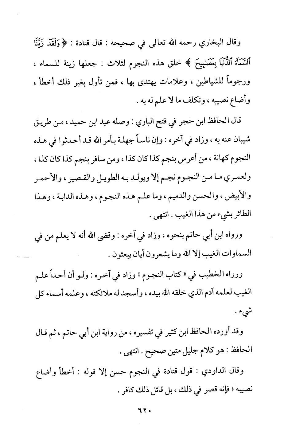وقال البخاري رحمه الله تعالى في صحيحه: قال قتادة: {وَلَقَدْ زَيَّنَّا السَّمَاءَ الدُّنْيَا بِمَصَابِيحَ} خلق هذه النجوم لثلاث؛ جعلها زينة للسماء، ورجومًا للشياطين، وعلامات يهتدي بها، فمن تأول بغير ذلك أخطأ، وأضاع نصيبه، وتكلف ما لا علم له به.