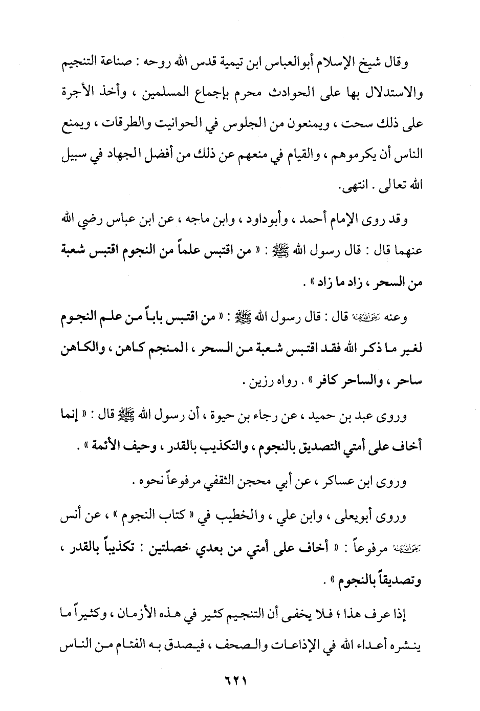 وقد روى الإمام أحمد، وأبو داود، وابن ماجة، عن ابن عباس -رضي الله عنهما- قال: قال رسول الله - صلى الله عليه وسلم -: «من اقتبس علمًا من النجوم اقتبس شعبة من السحر، زاد ما زاد».