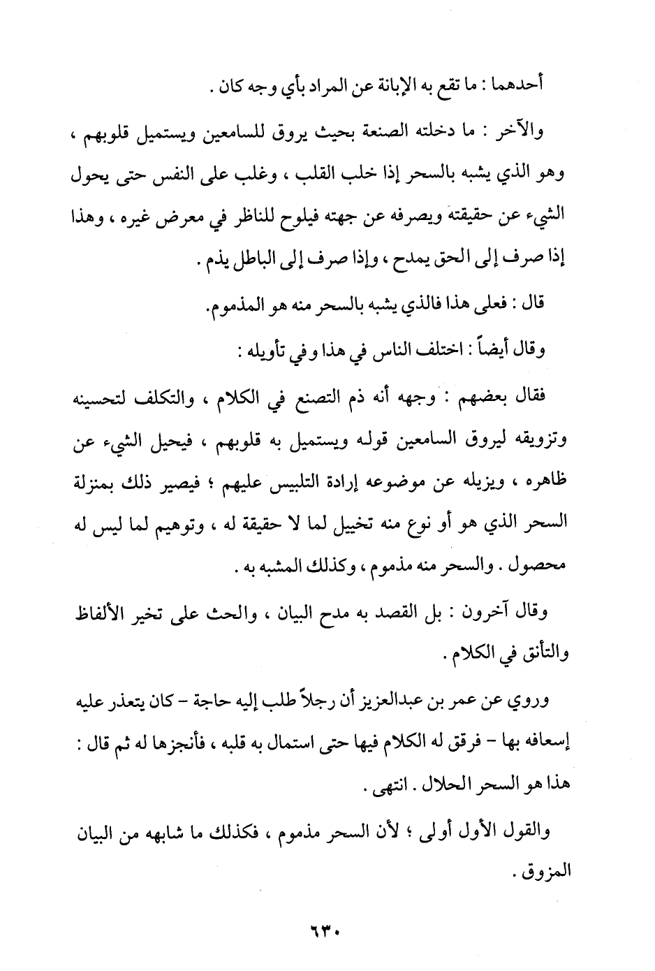 والآخر: ما دخلته الصنعة بحيث يروق للسامعين ويستميل قلوبهم، وهو الذي يشبه بالسحر إذا خلب القلب وغلب على النفس، حتى يحول الشيء عن حقيقته ويصرفه عن جهته، فيلوح للناظر في معرض غيره، وهذا إذا صرف إلى الحق يمدح، وإذا صرف إلى الباطل يذم.