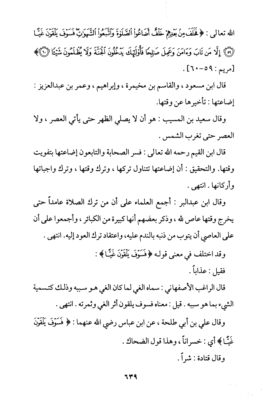 الله تعالى: {فَخَلَفَ مِنْ بَعْدِهِمْ خَلْفٌ أَضَاعُوا الصَّلَاةَ وَاتَّبَعُوا الشَّهَوَاتِ فَسَوْفَ يَلْقَوْنَ غَيًّا * إِلَّا مَنْ تَابَ وَآَمَنَ وَعَمِلَ صَالِحًا فَأُولَئِكَ يَدْخُلُونَ الْجَنَّةَ وَلَا يُظْلَمُونَ شَيْئًا} [مريم: 59 - 60].