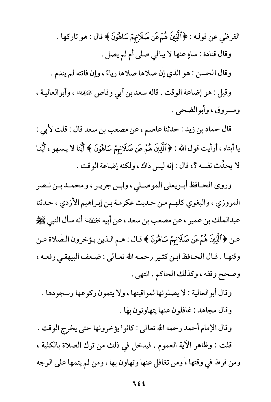 وروى الحافظ أبو يعلى الموصلي، وابن جرير، ومحمد بن نصر المروزي، والبغوي، كلهم من حديث عكرمة بن إبراهيم الأزدي، حدثنا عبد الملك بن عمير، عن مصعب بن سعد، عن أبيه - رضي الله عنه - أنه سأل النبي - صلى الله عليه وسلم - عن {الَّذِينَ هُمْ عَنْ صَلَاتِهِمْ سَاهُونَ} قال: «هم الذين يؤخرون الصلاة عن وقتها» قال الحافظ ابن كثير رحمه الله تعالى: ضعف البيهقي رفعه، وصحح وقفه، وكذلك الحاكم. انتهى.