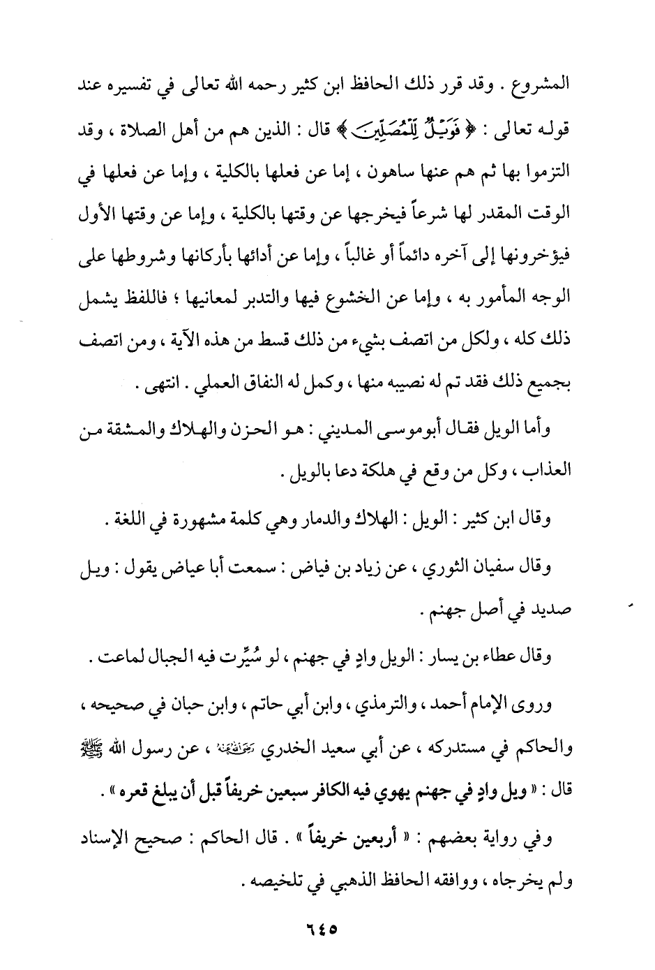 وقد قرر ذلك الحافظ ابن كثير رحمه الله تعالى في تفسيره عند قوله تعالى: {فَوَيْلٌ لِلْمُصَلِّينَ} قال: الذين هم من أهل الصلاة وقد التزموا بها، ثم هم عنها ساهون، إما عن فعلها بالكلية، وإما عن فعلها في الوقت المقدر لها شرعًا فيخرجها عن وقتها بالكلية، وإما عن وقتها الأول فيؤخرونها إلى آخره دائمًا أو غالبًا، وإما عن أدائها بأركانها وشروطها على الوجه المأمور به، وإما عن الخشوع فيها والتدبر لمعانيها؛ فاللفظ يشمل ذلك كله، ولكن من اتصف بشيء من ذلك قسط من هذه الآية، ومن اتصف بجميع ذلك فقد تم له نصيبه منها وكمل له النفاق العملي. انتهى.