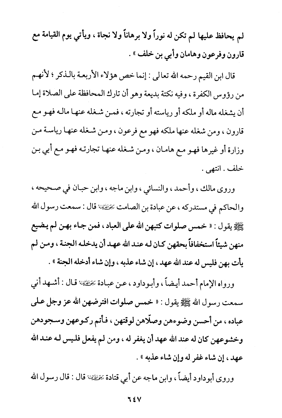 لم يحافظ عليها لم تكن له نورًا ولا برهانًا ولا نجاة، ويأتي يوم القيامة مع قارون وفرعون وهامان وأبي بن خلف».