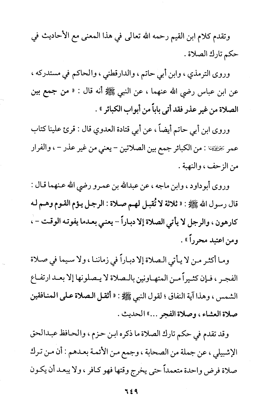 وتقدم كلام ابن القيم رحمه الله تعالى في هذا المعنى مع الأحاديث في حكم تارك الصلاة.
