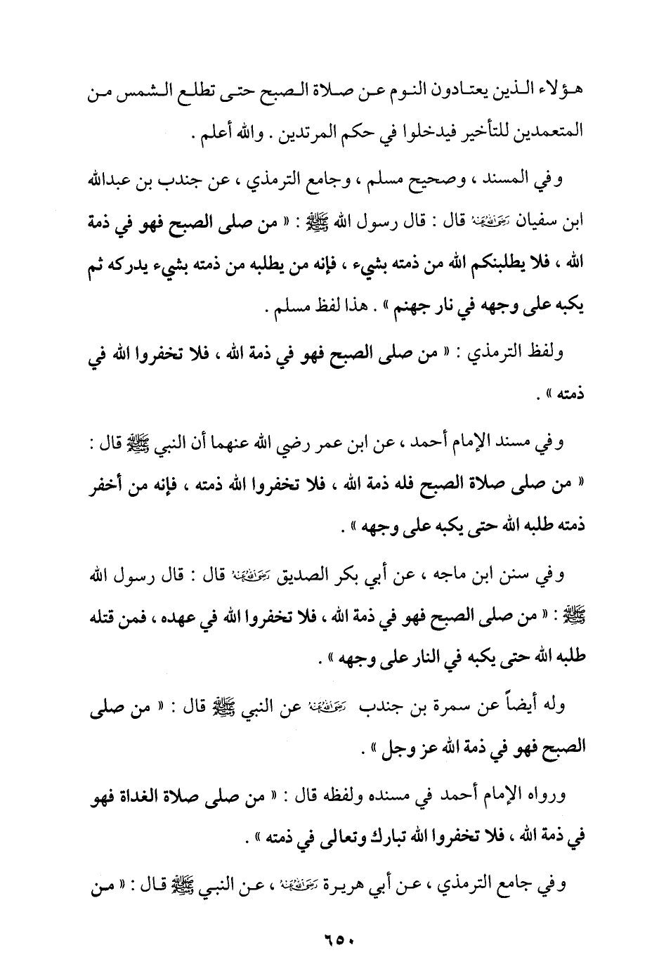 وفي المسند، وصحيح مسلم، وجامع الترمذي، عن جندب بن عبد الله بن سفيان - رضي الله عنه - قال: قال رسول الله - صلى الله عليه وسلم -: «من صلى الصبح فهو في ذمة الله، فلا يطلبنكم الله من ذمته بشيء، فإنه من يطلبه من ذمته بشيء يدركه ثم يكبه على وجهه في نار جهنم» هذا لفظ مسلم.