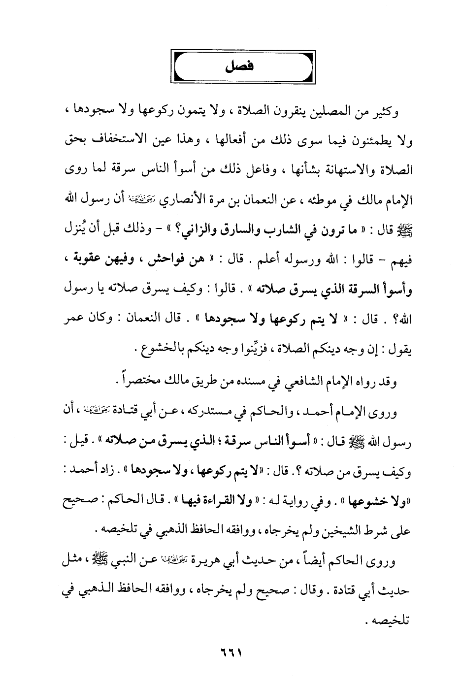 وروى الإمام أحمد، والحاكم في مستدركه، عن أبي قتادة - رضي الله عنه -، أن رسول الله - صلى الله عليه وسلم - قال: «أسوأ الناس سرقة الذي يسرق من صلاته» قيل: وكيف يسرق من صلاته؟ قال: «لا يتم ركوعها، ولا سجودها» زاد أحمد: «ولا خشوعها» وفي رواية له: «ولا القراءة فيها» قال الحاكم: صحيح على شرط الشيخين ولم يخرجاه، ووافقه الحافظ الذهبي في تلخيصه.