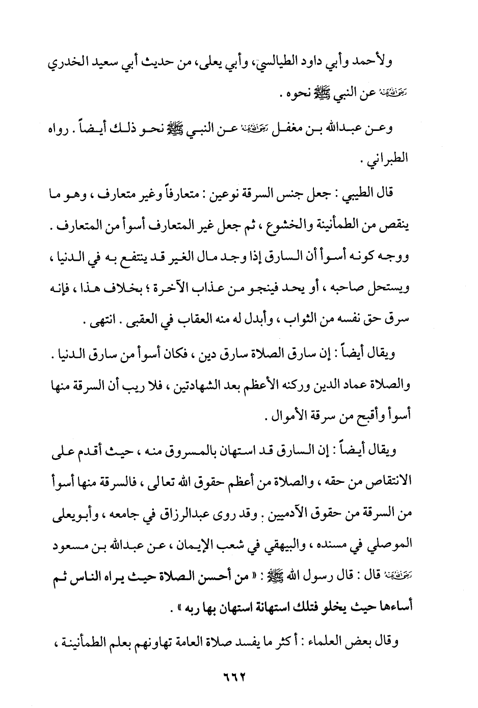قال الطيبِي: جعل جنس السرقة نوعين: متعارفًا وغير متعارفٍ، وهو ما ينقص من الطمأنينة والخشوع، ثم جعل غير المتعارف أسوأ من المتعارف، ووجه كونه أسوأ أن السارق إذا وجد مال الغير قد ينتفع به في الدنيا، ويستحل صاحبه، أو يَحِد فينجو من عذاب الآخرة، بخلاف هذا، فإنه سرق حق نفسه من الثواب، وأبدل له منه العقاب في العُقبى. انتهى.