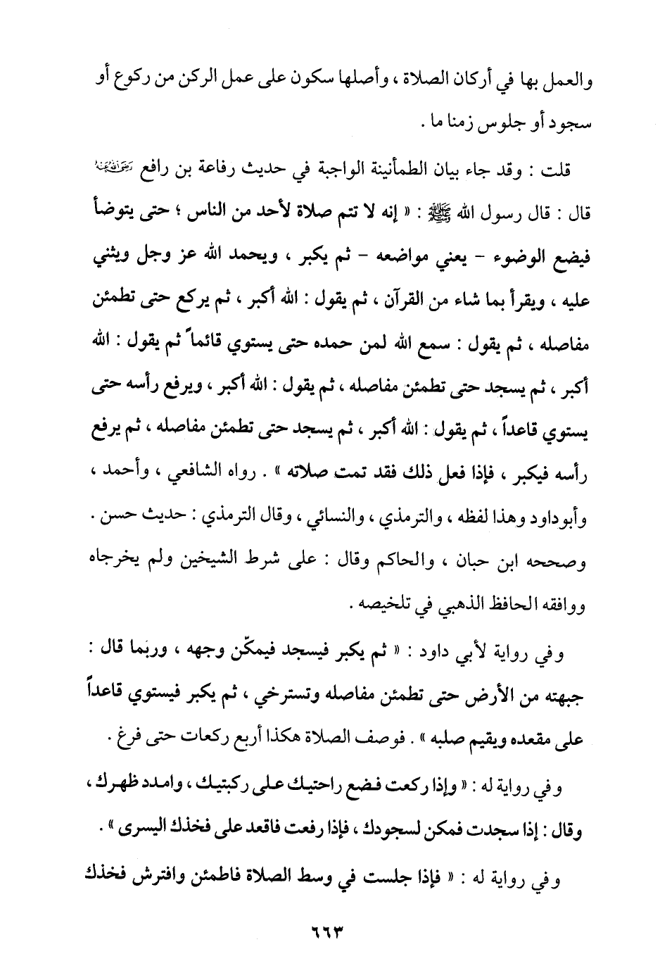 قلت: وقد جاء بيان الطمأنينة الواجبة في حديث رفاعة بن رافع - رضي الله عنه - قال: قال رسول الله - صلى الله عليه وسلم -: «إنه لا تتم صلاة لأحد من الناس حتى يتوضأ فيضع الوضوء -يعني مواضعه- ثم يكبر، ويحمد الله عز وجل ويثني عليه، ويقرأ بما شاء من القرآن، ثم يقول، الله أكبر، ثم يركع حتى تطمئن مفاصله، ثم يقول: سمع الله لمن حمده حتى يستوي قائمًا ثم يقول: الله أكبر، ثم يسجد حتى تطمئن مفاصلة، ثم يقول: الله أكبر، ويرفع رأسه حتى يستوي قاعدا، ثم يقول: الله أكبر، ثم يسجد حتى تطمئن مفاصله، ثم يرفع رأسه فيكبر، فإذا فعل ذلك فقد تمت صلاته» رواه الشافعي، وأحمد، وأبو داود وهذا لفظه، والترمذي، والنسائي، وصححه ابن حبان، وقال الترمذي: حديث حسن، وصححه الحاكم وقال: على شرط الشيخين ولم يخرجاه، ووافقه الحافظ الذهبي في تلخيصه.