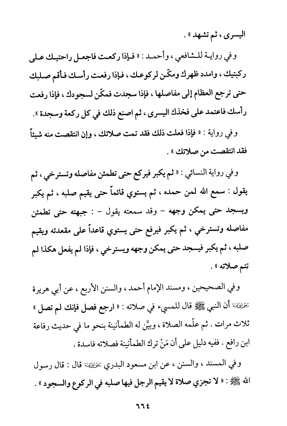 وفي المسند، والسنن، عن ابن مسعود البدري - رضي الله عنه - قال: قال رسول الله - صلى الله عليه وسلم -: «لا تجزي صلاة لا يقيم الرجل فيها صلبه في الركوع والسجود»