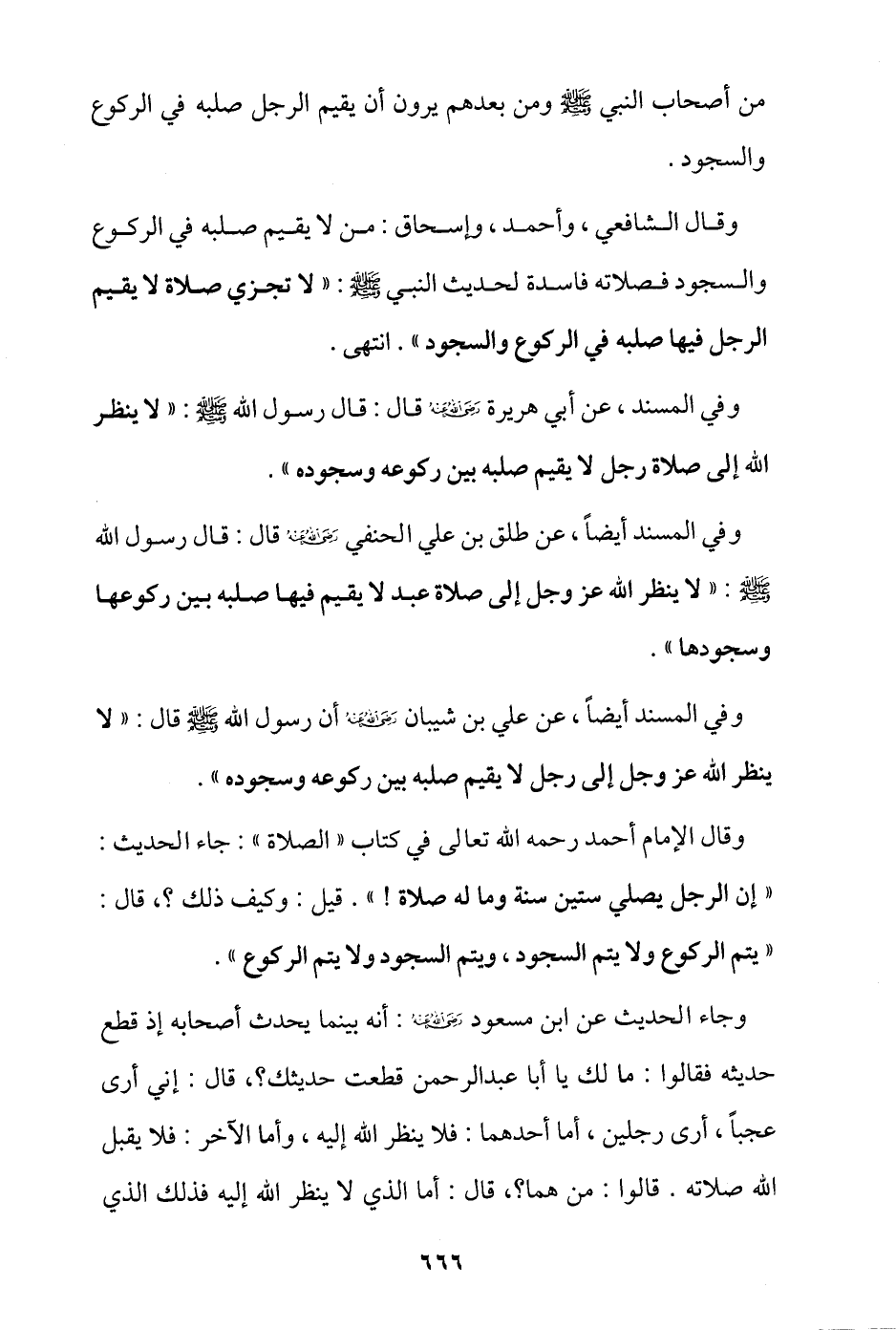 وفي المسند، عن أبي هريرة - رضي الله عنه - قال: قال رسول الله - صلى الله عليه وسلم -: «لا ينظر الله إلى صلاة رجل لا يقيم صلبه بين ركوعه وسجوده».