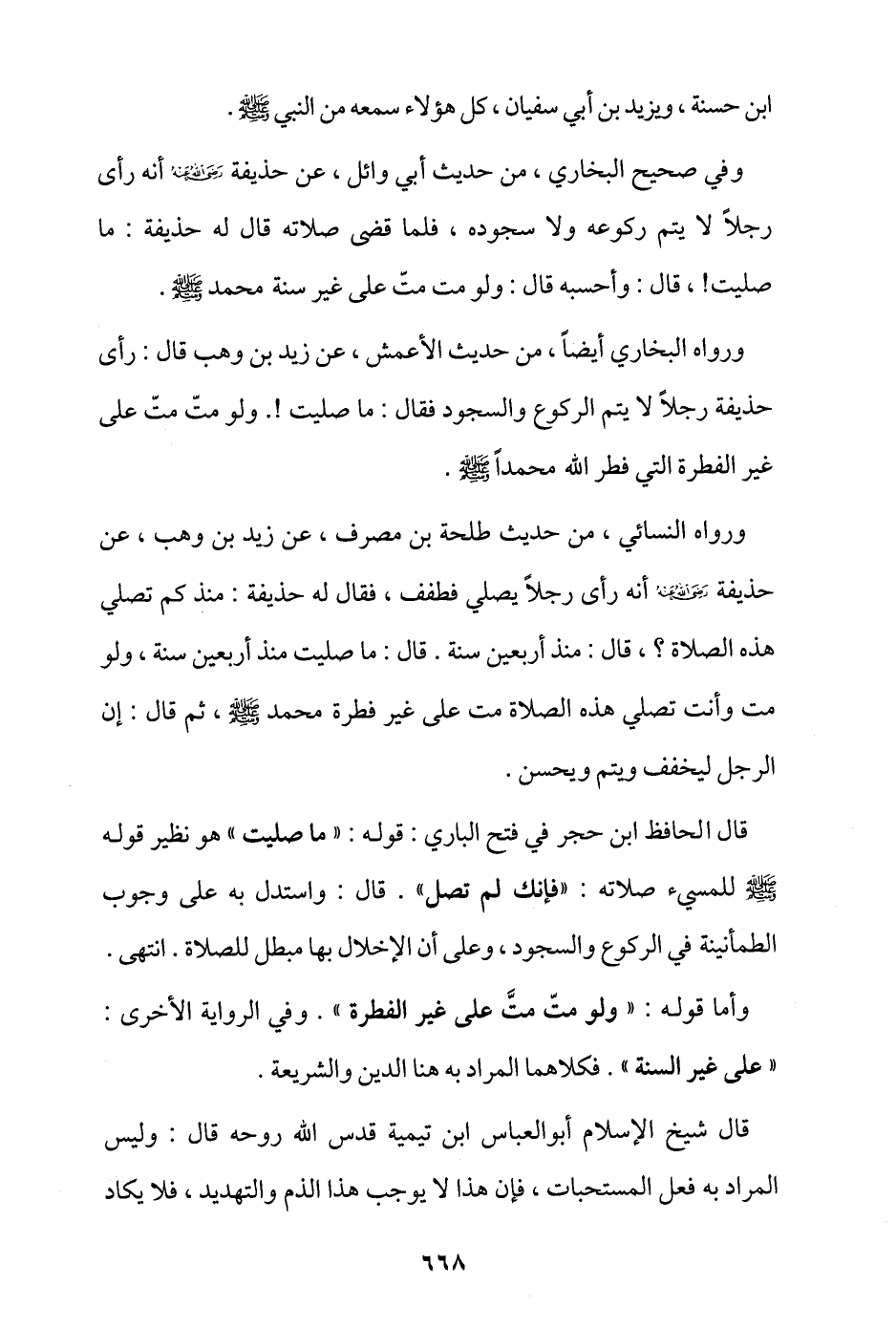 وفي صحيح البخاري، من حديث أبي وائل، عن حذيفة - رضي الله عنه - أنه رأى رجلا لا يتم ركوعه ولا سجوده، فلما قضى صلاته قال له حذيفة: ما صليت! قال: وأحسبه قال: ولو مت متّ على غير سنة محمد - صلى الله عليه وسلم -.