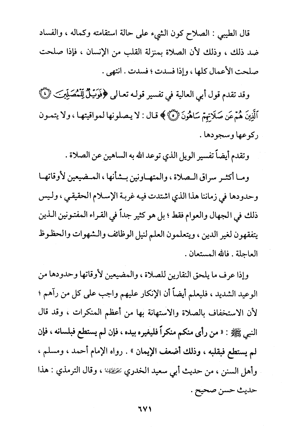 وإذا عرف ما يلحق النقارين للصلاة، والمضيعين لأوقاتها وحدودها من الوعيد الشديد، فليعلم أيضا أن الإنكار عليهم واجب على كل من رآهم؛ لأن الاستخفاف بالصلاة والاستهانة بها من أعظم المنكرات، وقد قال النبي - صلى الله عليه وسلم -: «من رأى منكم منكرًا فليغيره بيده، فإن لم يستطع فبلسانه، فإن لم يستطع فبقلبه، وذلك أضعف الإيمان» رواه الإمام أحمد، ومسلم، وأهل السنن، من حديث أبي سعيد الخدري - رضي الله عنه -، وقال الترمذي: هذا حديث حسن صحيح.