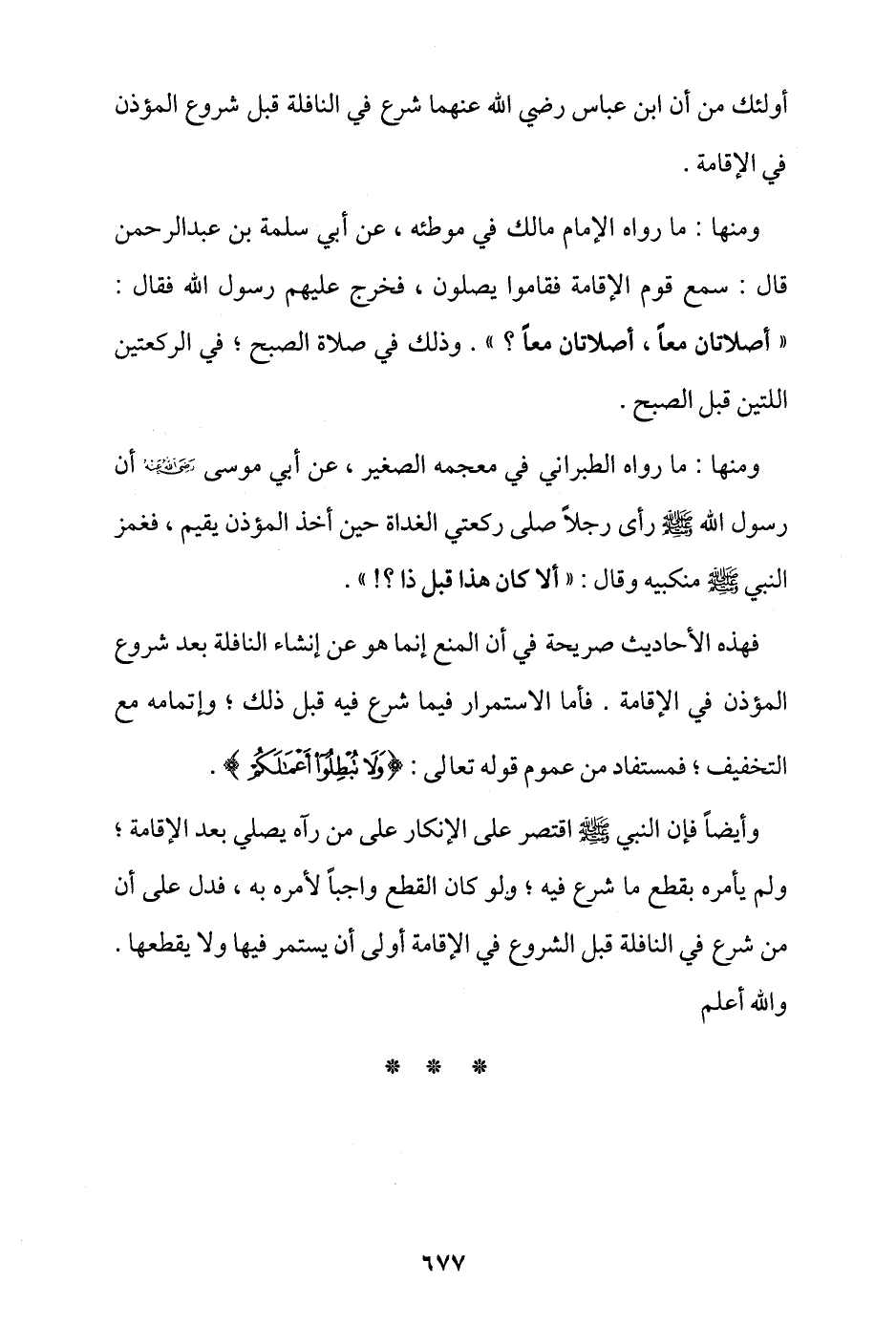 فهذه الأحاديث صريحة في أن المنع إنما هو عن إنشاء النافلة بعد شروع المؤذن في الإقامة، فأما الاستمرار فيما شرع فيه قبل ذلك وإتمامه مع التخفيف فمستفاد من عموم قوله تعالى: {وَلَا تُبْطِلُوا أَعْمَالَكُمْ}.