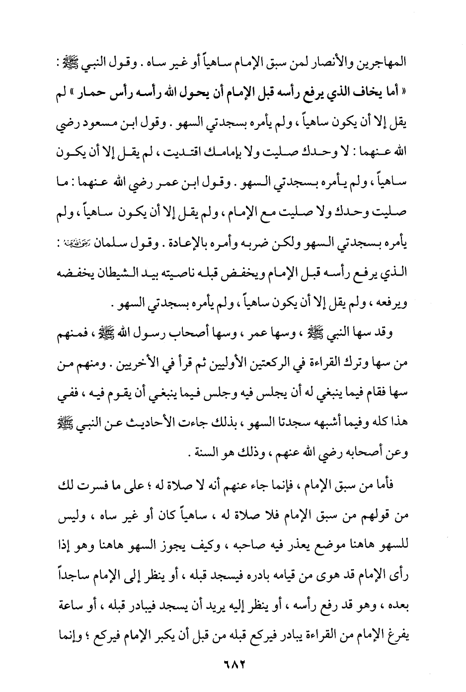 المهاجرين والأنصار لمن سبق الإمام ساهيًا أو غير ساه، وقول النبي - صلى الله عليه وسلم -: «أما يخاف الذي يرفع رأسه قبل الإمام أن يحول الله رأسه رأس حمار» لم يقل إلا أن يكون ساهيًا، ولم يأمره بسجدتي السهو، وقول ابن مسعود -رضي الله عنهما-: لا وحدك صليت ولا بإمامك اقتديت، لم يقل إلا أن يكون ساهيًا، ولم يأمره بسجدتي السهو، وقول ابن عمر -رضي الله عنهما-: ما صليت وحدك ولا صليت مع الإمام، ولم يقل إلا أن يكون ساهيًا، ولم يأمره بسجدتي السهو، ولكن ضربه وأمره بالإعادة، وقول سلمان - رضي الله عنه -: الذي يرفع رأسه قبل الإمام ويخفض قبله ناصيته بيد الشيطان يخفضه ويرفعه، ولم يقل إلا أن يكون ساهيًا، ولم يأمره بسجدتي السهو.