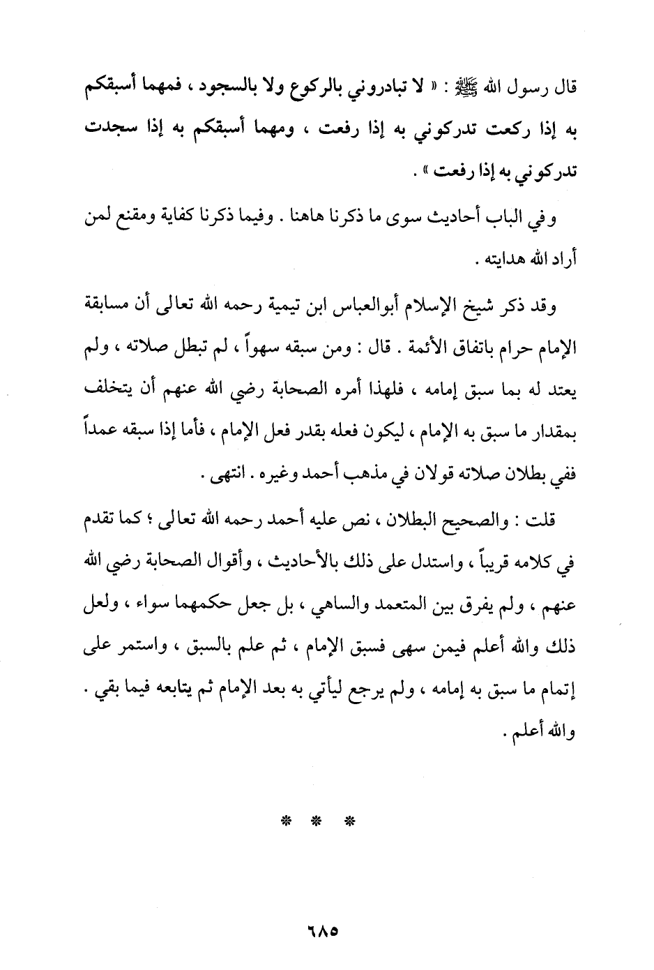 وقد ذكر شيخ الإسلام أبو العباس ابن تيمية رحمه الله تعالى أن مسابقة الإمام حرام باتفاق الأئمة، قال: ومن سبقه سهوًا لم تبطل صلاته ولم يعتد له بما سبق إمامه؛ فلهذا أمره الصحابة -رضي الله عنهم- أن يتخلف بمقدار ما سبق به الإمام، ليكون فعله بقدر فعل الإمام، فأما إذا سبقه عمدًا ففي بطلان صلاته قولان في مذهب أحمد وغيره. انتهى.
