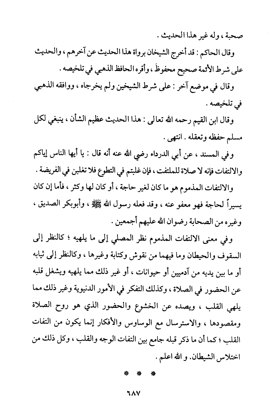 وفي المسند، عن أبي الدرداء - رضي الله عنه - أنه قال: «يا أيها الناس، إياكم والالتفات؛ فإنه لا صلاة للملتفت، فإن غُلبتم في التطوع فلا تغلبن في الفريضة».