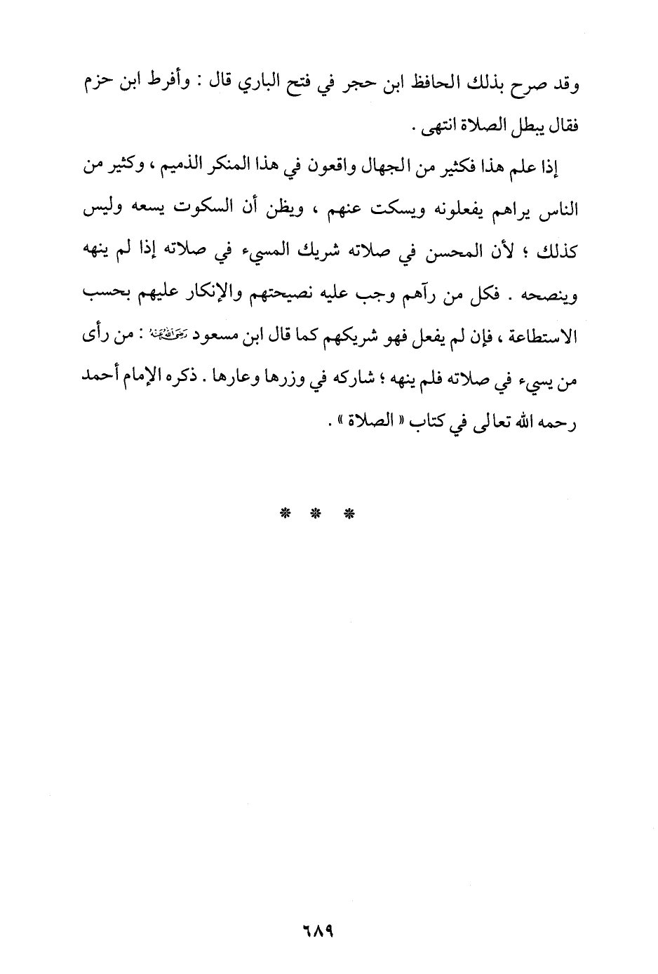 إذا علم هذا فكثير من الجهال واقعون في هذا المنكر الذميم، وكثير من الناس يراهم يفعلون ويسكت عنهم، ويظن أن السكوت يسعه وليس كذلك؛ لأن المحسن في صلاته شريك المسيء في صلاته إذا لم ينهه وينصحه، فكل من رآهم وجب عليه نصيحتهم والإنكار عليهم بحسب الاستطاعة، فإن لم يفعل فهو شريكهم كما قال ابن مسعود - رضي الله عنه -: من رأى من يسيء في صلاته فلم ينهه شاركه في وزرها وعارها. ذكره الإمام أحمد رحمه الله تعالى في كتاب (الصلاة).