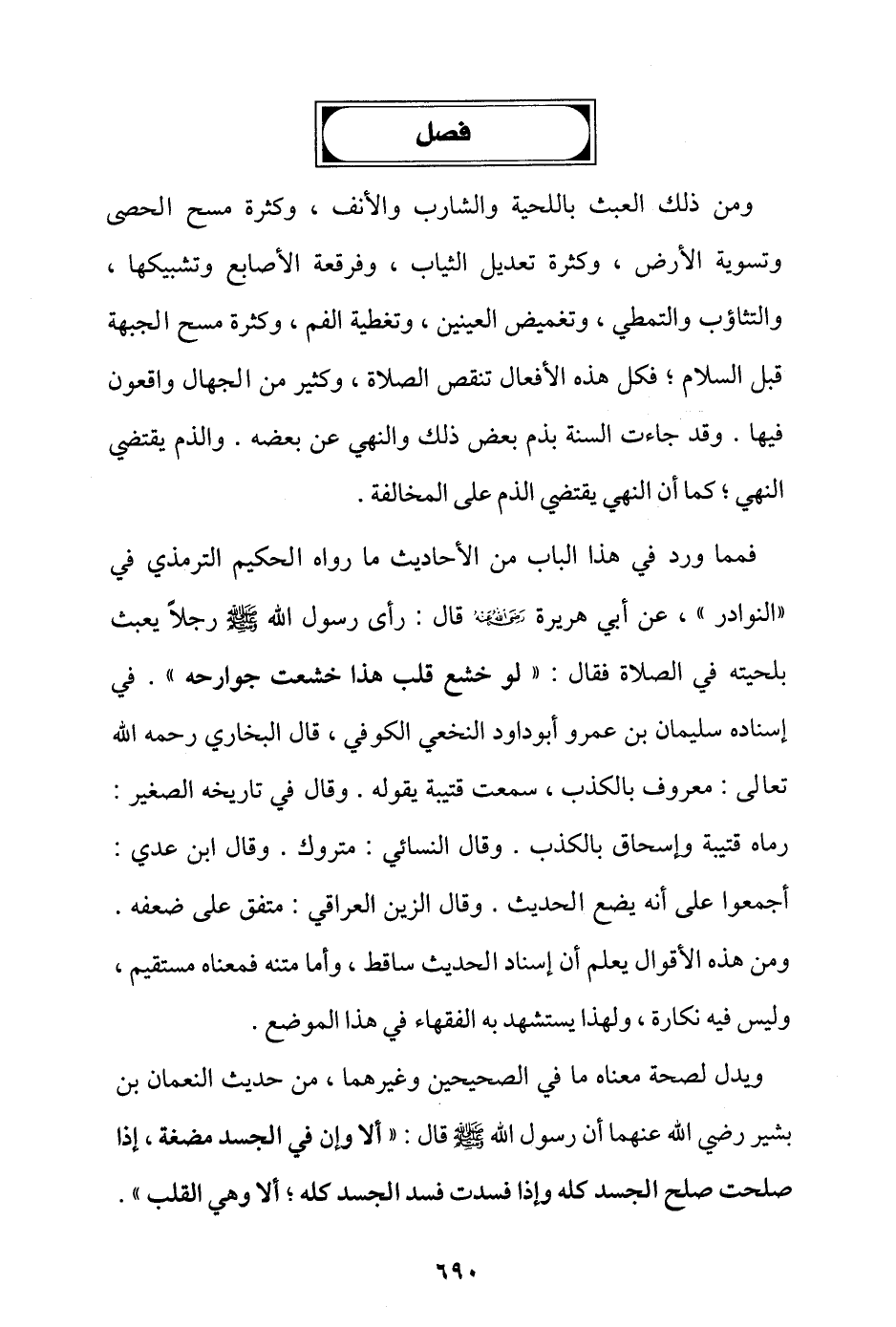 فمما ورد في هذا الباب من الأحاديث ما رواه الحكيم الترمذي في (النوادر) عن أبي هريرة - رضي الله عنه - قال: رأي رسول الله - صلى الله عليه وسلم - رجلا يعبث بلحيته في الصلاة فقال: «لو خشع قلب هذا خشعت جوارحه» في إسناده سليمان بن عمرو أبو داود النخعي الكوفي، قال البخاري رحمه الله تعالى: معروف بالكذب، سمعت قتيبة يقول. وقال في تاريخه الصغير: رماه قتيبة وإسحاق بالكذب. وقال النسائي: متروك. وقال ابن عدي: أجمعوا على أنه يضع الحديث. وقال الزين العراقي: متفق على ضعفه. ومن هذه الأقوال يعلم أن إسناد الحديث ساقط، وأما متنه فمعناه مستقيم وليس فيه نكارة، ولهذا يستشهد به الفقهاء في هذا الموضع.