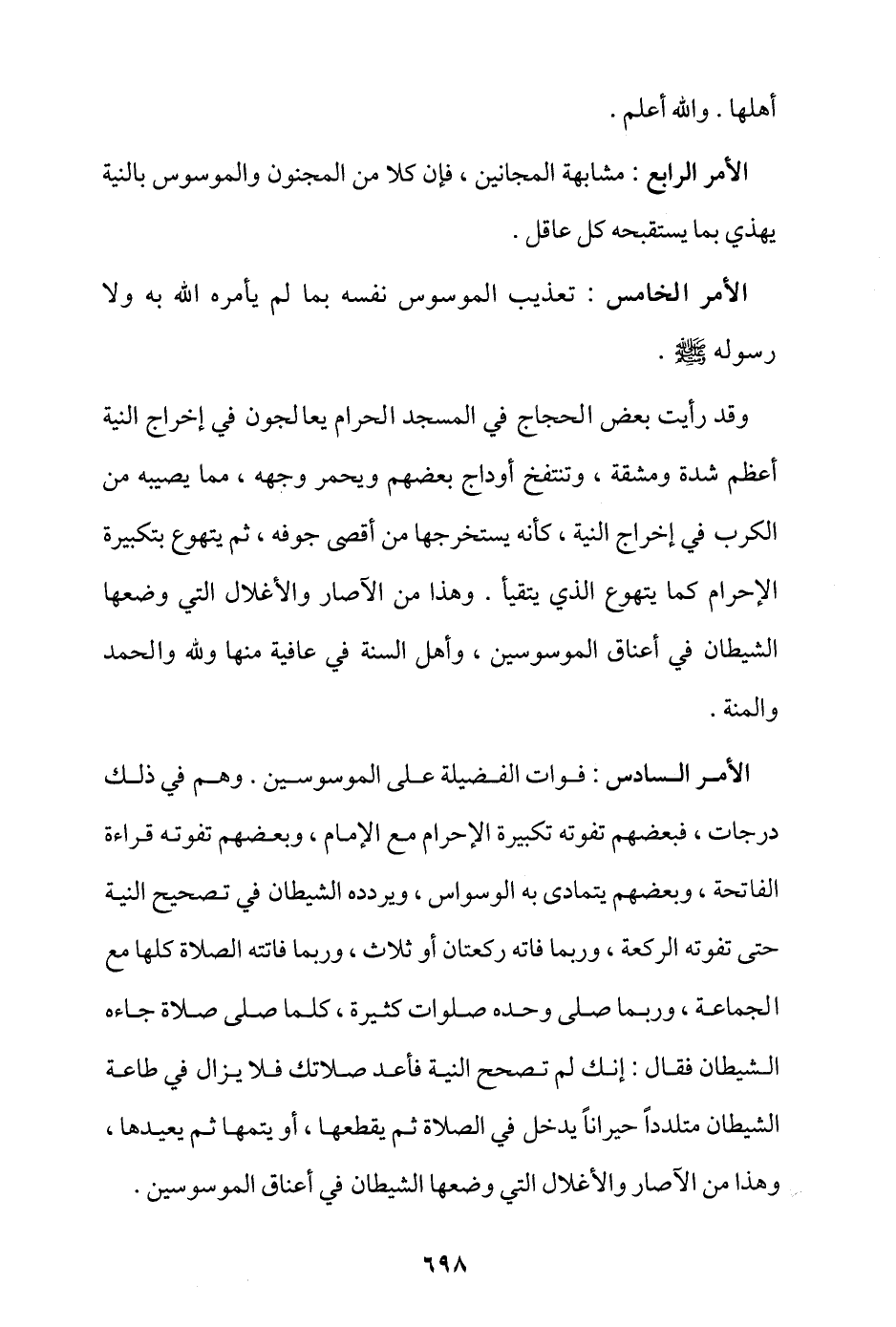 الأمر الرابع: مشابهة المجانين، فإن كلا من المجنون والموسوس بالنية يهذي بما يستقبحه كل عاقل.