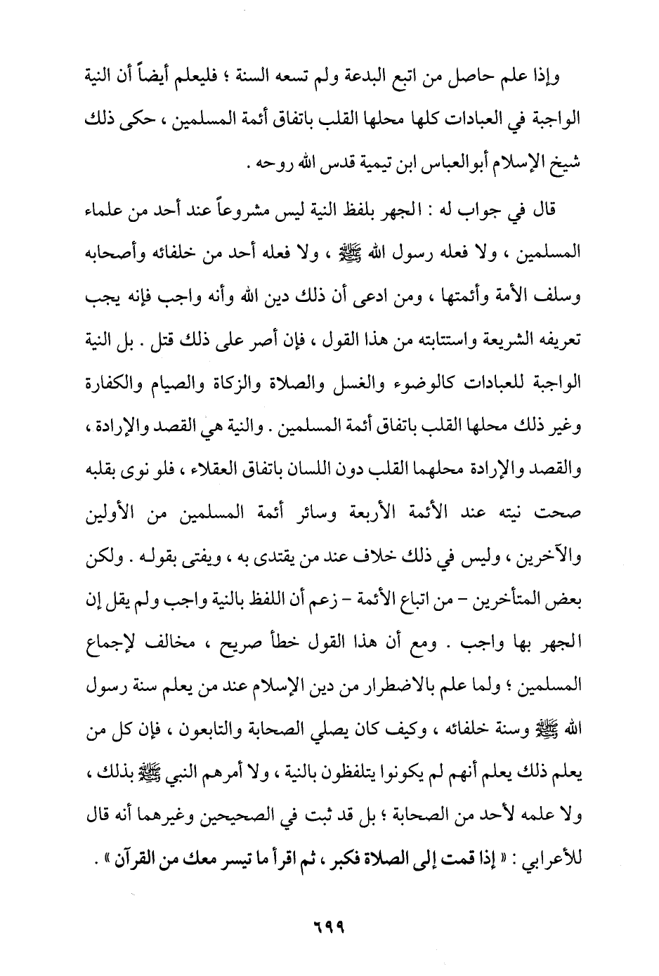 قال في جواب له: الجهر بلفظ النية ليس مشروعًا عند أحد من علماء المسلمين، ولا فعله رسول الله - صلى الله عليه وسلم -، ولا فعله أحد من خلفائه وأصحابه وسلف الأمة وأئمتها، ومن ادعى أن ذلك دين الله وأنه واجب فإنه يجب تعريفه الشريعة واستتابته من هذا القول، فإن أصر على ذلك قتل، بل النية الواجبة للعبادات كالوضوء والغسل والصلاة والزكاة والصيام والكفارة وغير ذلك محلها القلب باتفاق أئمة المسلمين، والنية هي القصد والإرادة، والقصد والإرادة محلهما القلب دون اللسان باتفاق العقلاء، فلو نوى بقلبه صحت نيته عند الأئمة الأربعة وسائر أئمة المسلمين من الأولين والآخرين، وليس في ذلك خلاف عند من يقتدي به ويفتي بقوله، ولكن بعض المتأخرين -من أتباع الأئمة- زعم أن اللفظ بالنية واجب ولم يقل إن الجهر بها واجب، ومع أن هذا القول خطأ صريح، مخالف لإجماع المسلمين؛ ولما عُلم بالاضطرار من دين الإسلام عند من يعلم سنة رسول الله - صلى الله عليه وسلم - وسنة خلفائه، وكيف كان يصلي الصحابة والتابعون، فإن كل من يعلم ذلك يعلم أنهم لم يكونوا يتلفظون بالنية، ولا أمرهم النبي - صلى الله عليه وسلم - بذلك، ولا علّمه لأحد من الصحابة، بل قد ثبت في الصحيحين وغيرهما أنه قال للأعرابي: «إذا قمت إلى الصلاة فكبر، ثم اقرأ ما تيسر معك من القرآن».