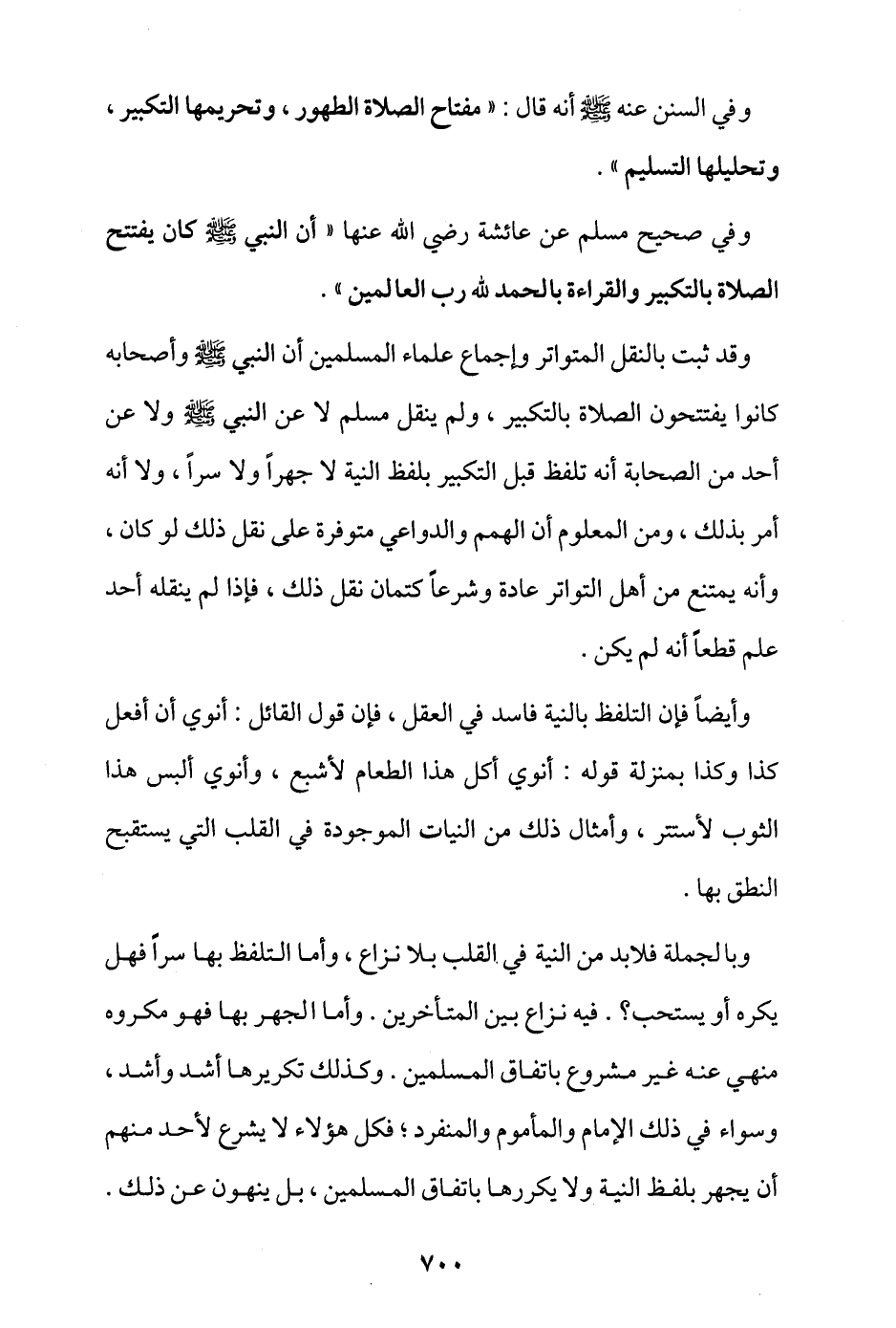 وقد ثبت بالنقل المتواتر وإجماع علماء المسلمين أن النبي - صلى الله عليه وسلم - وأصحابه كانوا يفتتحون الصلاة بالتكبير، ولم ينقل مسلم لا عن النبي - صلى الله عليه وسلم - ولا عن أحد من الصحابة أنه تلفظ قبل التكبير بلفظ النية لا جهرًا ولا سرًا، ولا أنه أمر بذلك، ومن المعلوم أن الهمم والدواعي متوفرة على نقل ذلك لو كان، وأنه يمتنع من أهل التواتر عادة وشرعًا كتمان نقل ذلك، فإذا لم ينقله أحد عُلم قطعًا أنه لم يكن.