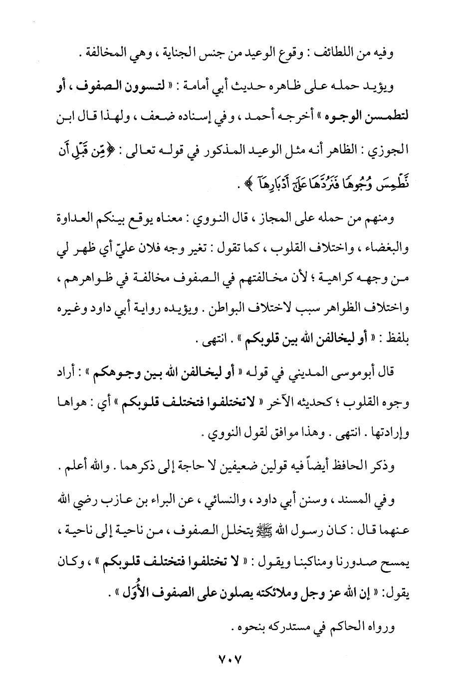 ومنهم من حملة على المجاز، قال النووي: معناه يوقع بينكم العداوة والبغضاء، واختلاف القلوب، كما تقول: تغير وجه فلان على أي ظهر لي من وجهه كراهية؛ لأن مخالفتهم في الصفوف مخالفة في ظواهرهم، واختلاف الظواهر سبب لاختلاف البواطن، ويؤيده رواية أبي داود وغيره بلفظ: «أو ليخالفن الله بين قلوبكم». انتهى.