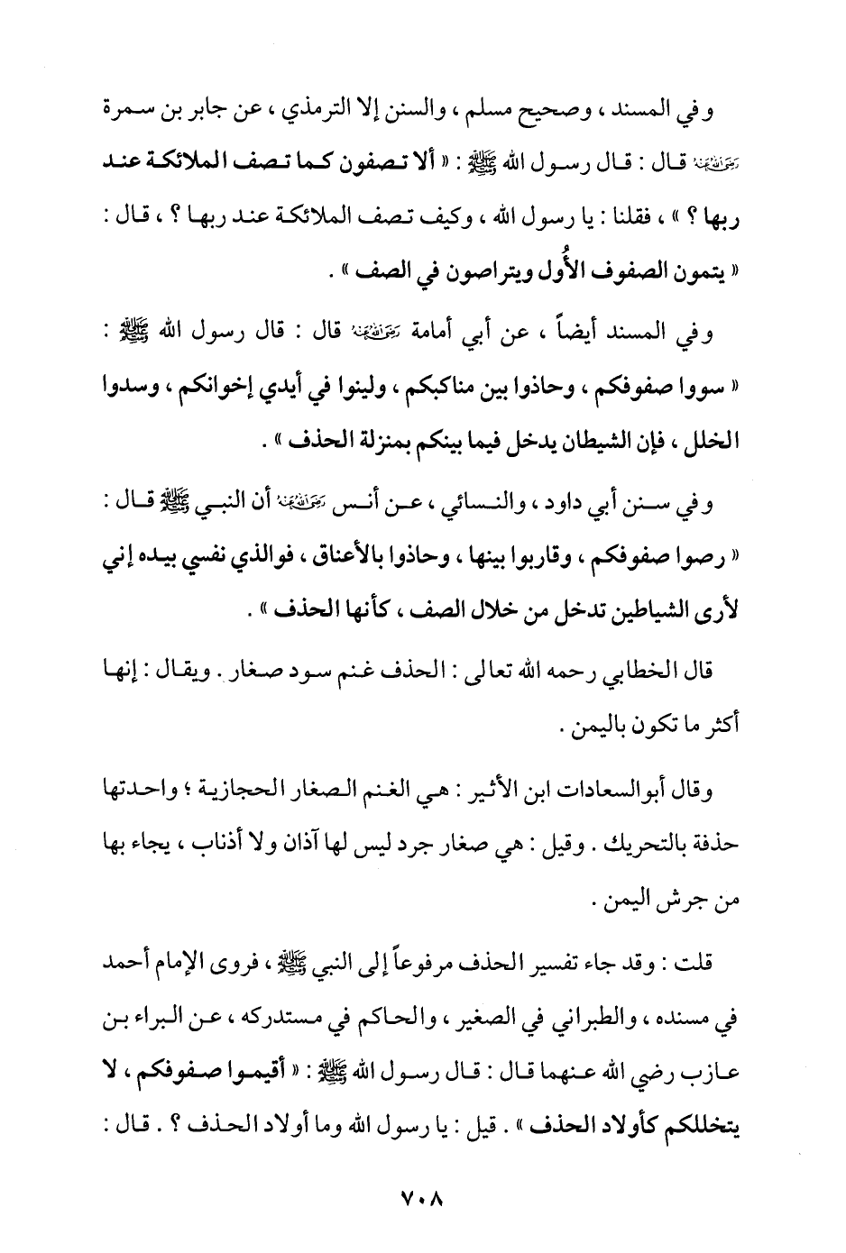 وفي المسند، وصحيح مسلم، والسنن إلا الترمذي، عن جابر بن سمرة - رضي الله عنه - قال: قال رسول الله - صلى الله عليه وسلم -: «ألا تصفون كما تصف الملائكة عند ربها؟» فقلنا: يا رسول الله، وكيف تصف الملائكة عند ربها؟ قال: «يتمون الصفوف الأول ويتراصون في الصف».