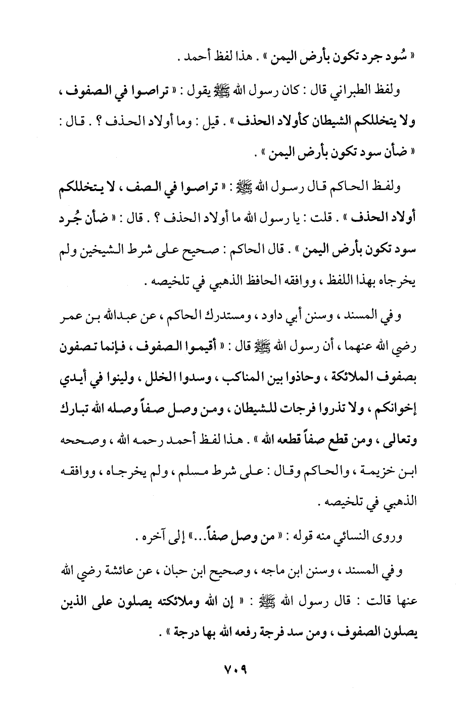 وفي المسند، وسنن أبي داود، ومستدرك الحاكم، عن عبد الله بن عمر -رضي الله عنهما- أن رسول الله - صلى الله عليه وسلم - قال: «أقيموا الصفوف، فإنما تصفون بصفوف الملائكة، وحاذوا بين المناكب، وسدوا الخلل، ولينوا في أيدي إخوانكم، ولا تذروا فرجات للشيطان، ومن وصل صفا وصله الله تبارك وتعالى، ومن قطع صفا قطعه الله» هذا لفظ أحمد رحمه الله، وصححه ابن خزيمة، والحاكم وقال: على شرط مسلم ولم يخرجاه، ووافقه الذهبي في تلخيصه.