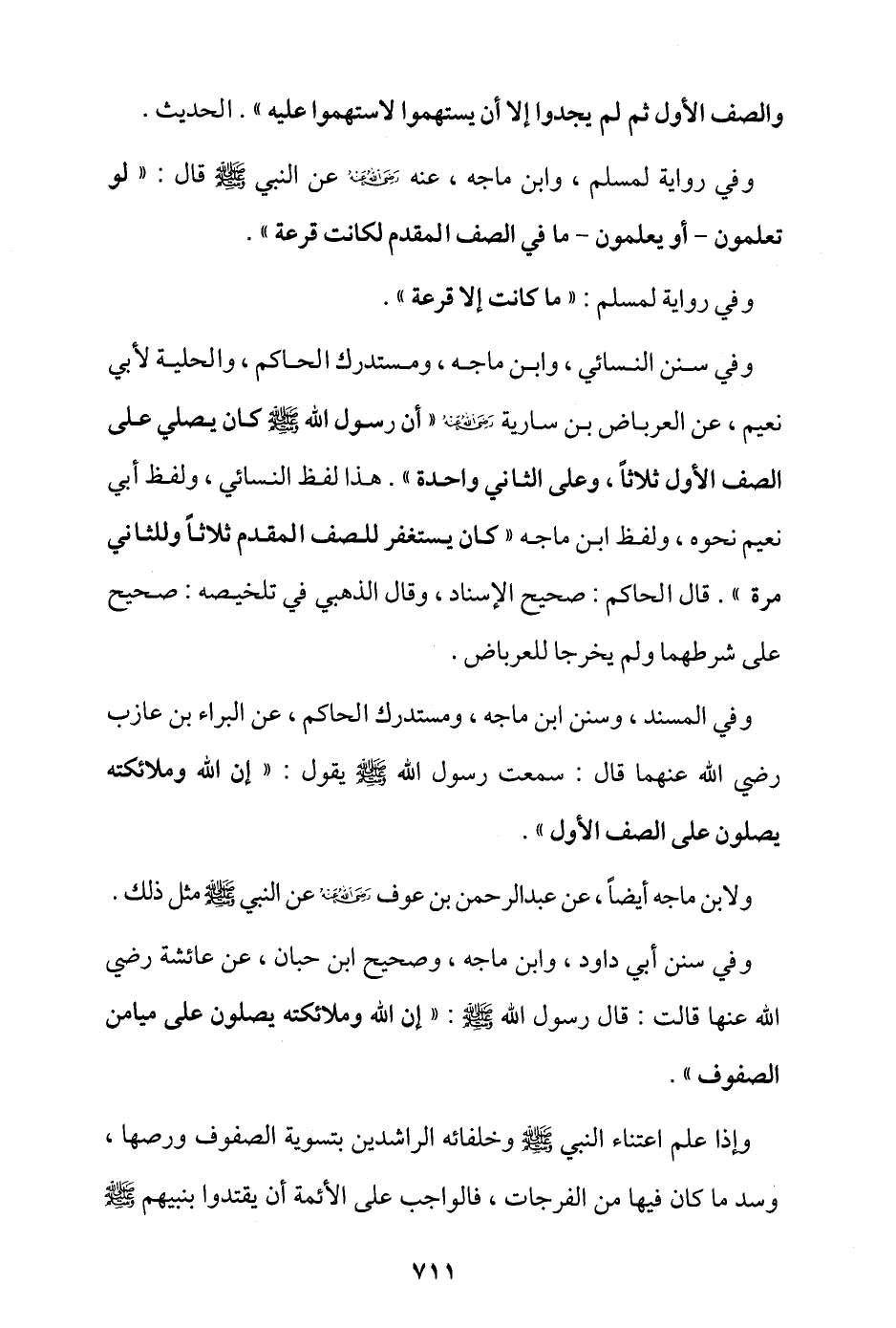 وفي سنن النسائي، وابن ماجة، ومستدرك الحاكم، والحلية لأبي نعيم، عن العرباض بن سارية - رضي الله عنه - أن رسول الله - صلى الله عليه وسلم - «كان يصلي على الصف الأول ثلاثًا، وعلى الثاني واحدة» هذا لفظ النسائي، ولفظ أبي نعيم نحوه، ولفظ ابن ماجة «كان يستغفر للصف المقدم ثلاثًا وللثاني مرة» قال الحاكم: صحيح الإسناد، وقال الذهبي في تلخيصه: صحيح على شرطهما ولم يخرجا للعرباض.