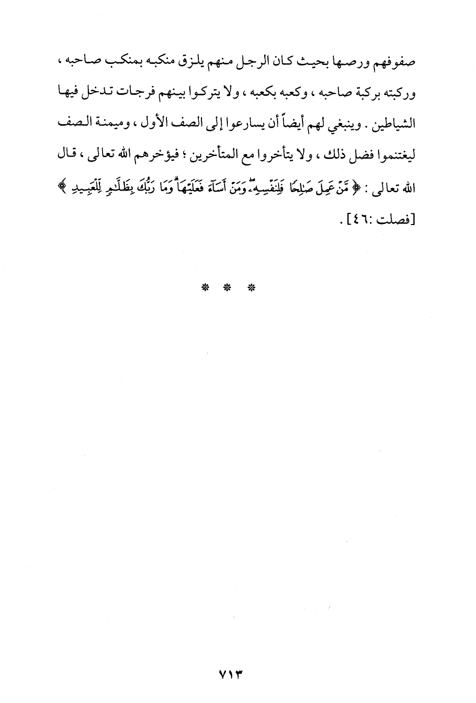 صفوفهم ورصها، بحيث كان الرجل منهم يلزق منكبه بمنكب صاحبه، وركبته بركبة صاحبه، وكعبه بكعبه، ولا يتركوا بينهم فرجات تدخل فيها الشياطين، وينبغي لهم أيضا أن يسارعوا إلى الصف الأول، وميمنة الصف ليغتنموا فضل ذلك، ولا يتأخروا مع المتأخرين فيؤخرهم الله تعالى، قال الله تعالى: {مَنْ عَمِلَ صَالِحًا فَلِنَفْسِهِ وَمَنْ أَسَاءَ فَعَلَيْهَا وَمَا رَبُّكَ بِظَلَّامٍ لِلْعَبِيدِ} [فصلت: 46].