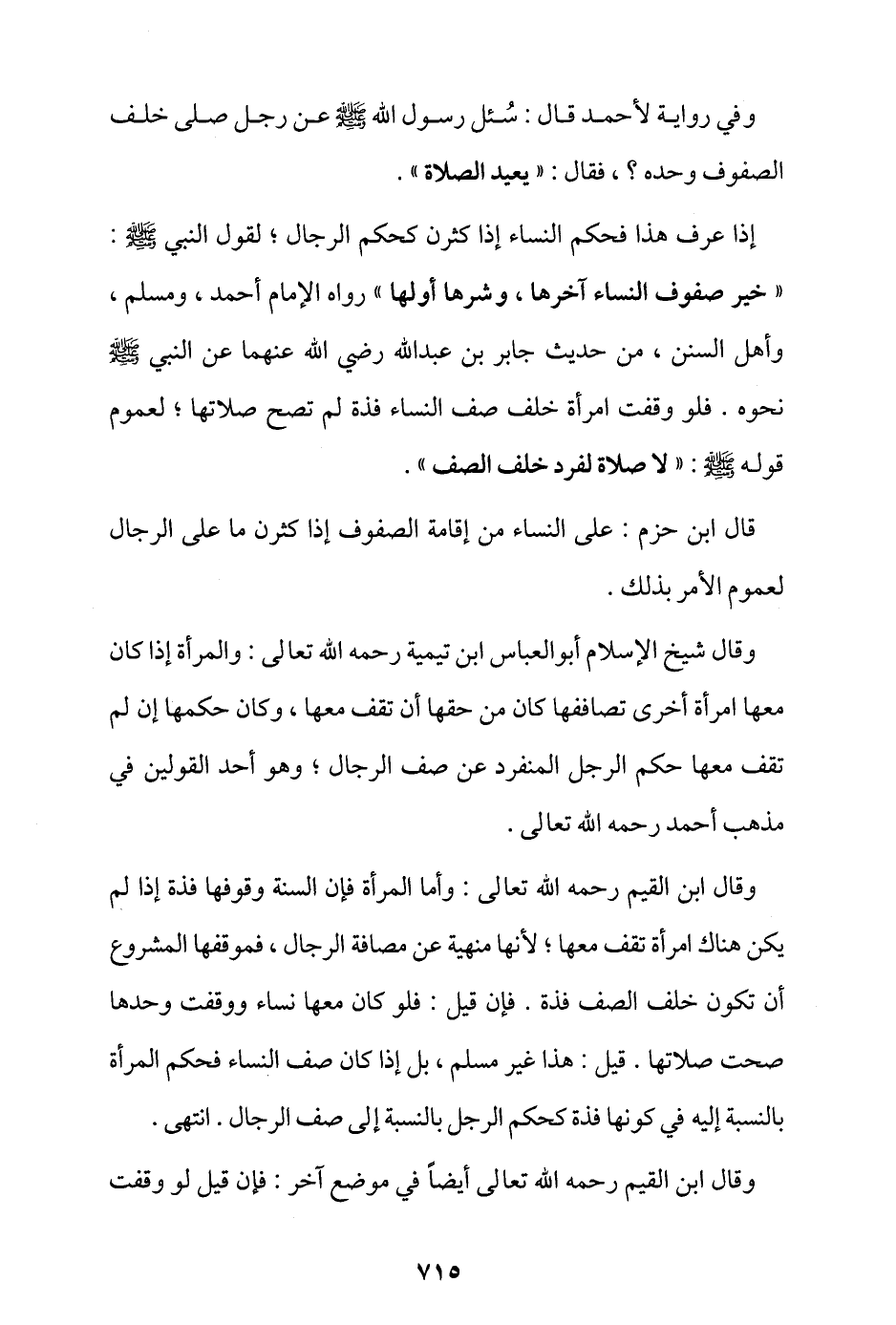 وقال ابن القيم رحمه الله تعالى: وأما المرأة فإن السنة وقوفها فذة إذا لم يكن هناك امرأة تقف معها؛ لأنها منهية عن مصافة الرجال، فموقفها المشروع أن تكون خلف الصف فذة، فإن قيل: فلو كان معها نساء ووقفت وحدها صحت صلاتها، قيل: هذا غير مسلم، بل إذا كان صف النساء فحكم المرأة بالنسبة إليه في كونها فذة كحكم الرجل بالنسبة إلى صف الرجال. انتهى.
