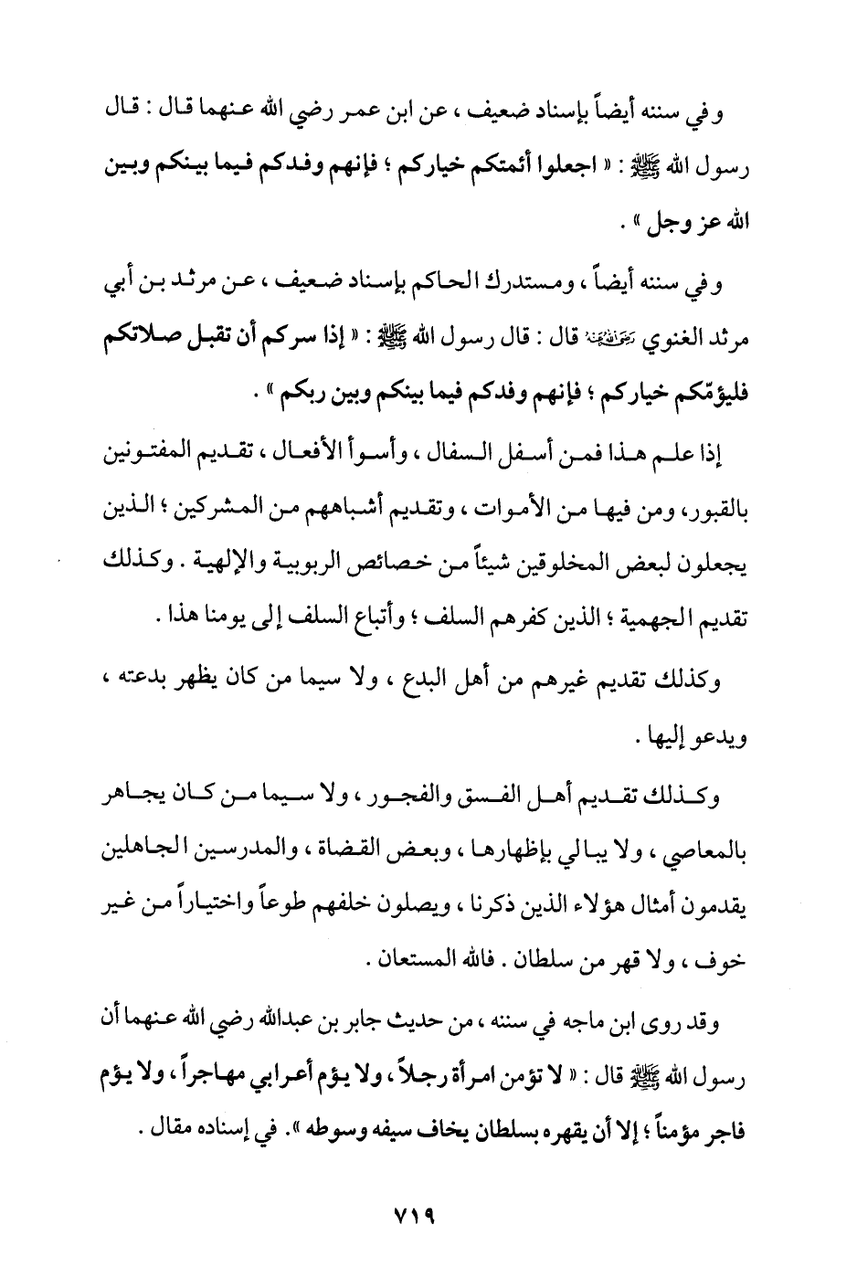وقد روى ابن ماجة في سننه، من حديث جابر بن عبد الله -رضي الله عنهما- أن رسول الله - صلى الله عليه وسلم - قال: «لا تَؤمَّنَّ امرأةٌ رجلا، ولا يَؤم أعرابي مهاجرًا، ولا يؤم فاجر مؤمنًا؛ إلا أن يقهره بسلطان يخاف سيفه وسوطه» في إسناده مقال.