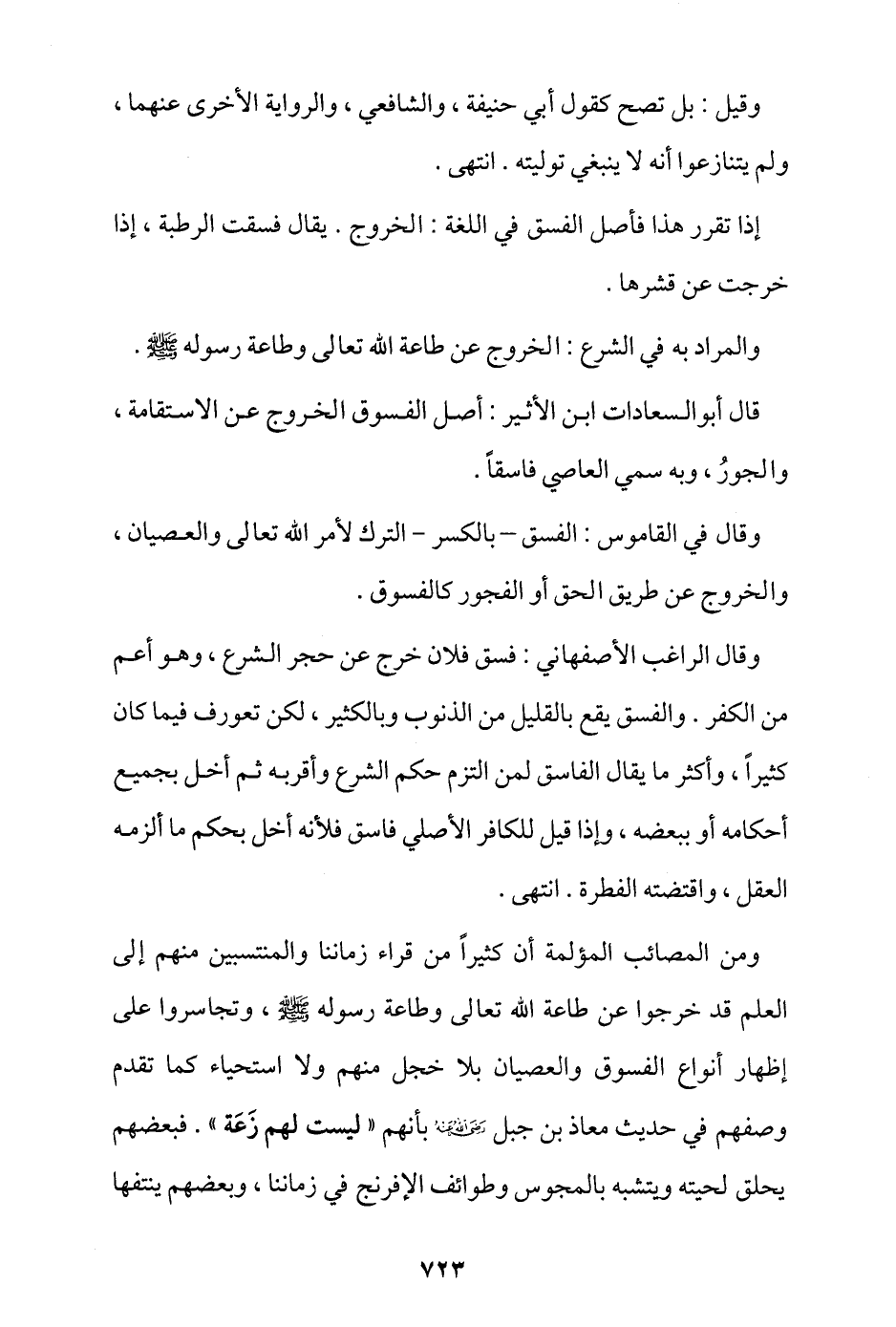 ومن المصائب المؤلمة أن كثيرًا من قراء زماننا والمنتسبين منهم إلى العلم قد خرجوا عن طاعة الله تعالى وطاعة رسوله - صلى الله عليه وسلم -، وتجاسروا على إظهار أنواع الفسوق والعصيان بلا خجل منهم ولا استحياء كما تقدم وصفهم في حديث معاذ بن جبل - رضي الله عنه - بأنهم «ليست لهم زعة»؛ فبعضهم يحلق لحيته ويتشبه بالمجوس وطوائف الإفرنج في زماننا، وبعضهم ينتفها
